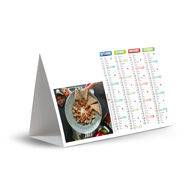 Chevalet de comptoir 3 faces illustré de plats apétissants et conviviaux. Photographies Adobestock - Unsplash.