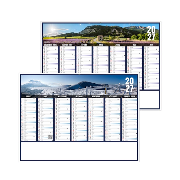 Vous aimez la montagne ? Alors venez découvrir notre modèle de calendrier bancaire publicitaire 2027 Liberté Auvergne-Rhône-Alpes, nous vous emmenons découvrir le Puy de Dôme en hiver et les champs de lavande du Diois dans la drome provençal ensoleillée. Ce calendrier possède 7 mois par face. Photographies Hervé Sentucq et Yves Duval.
