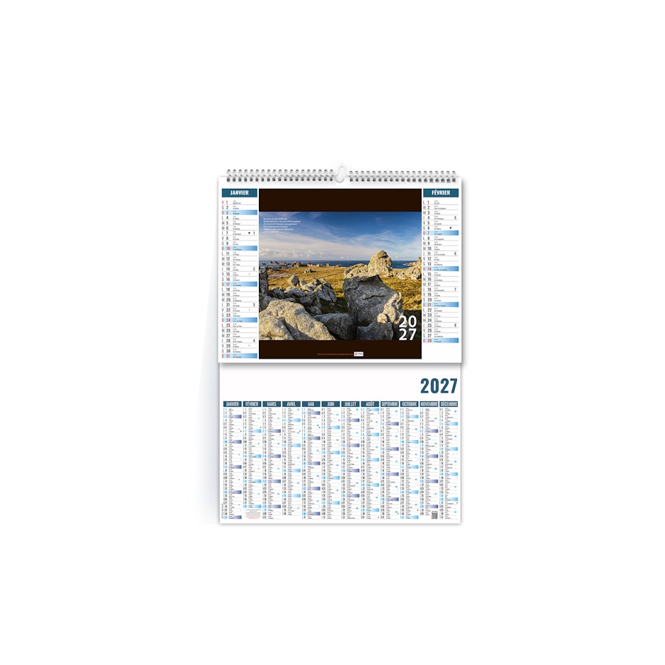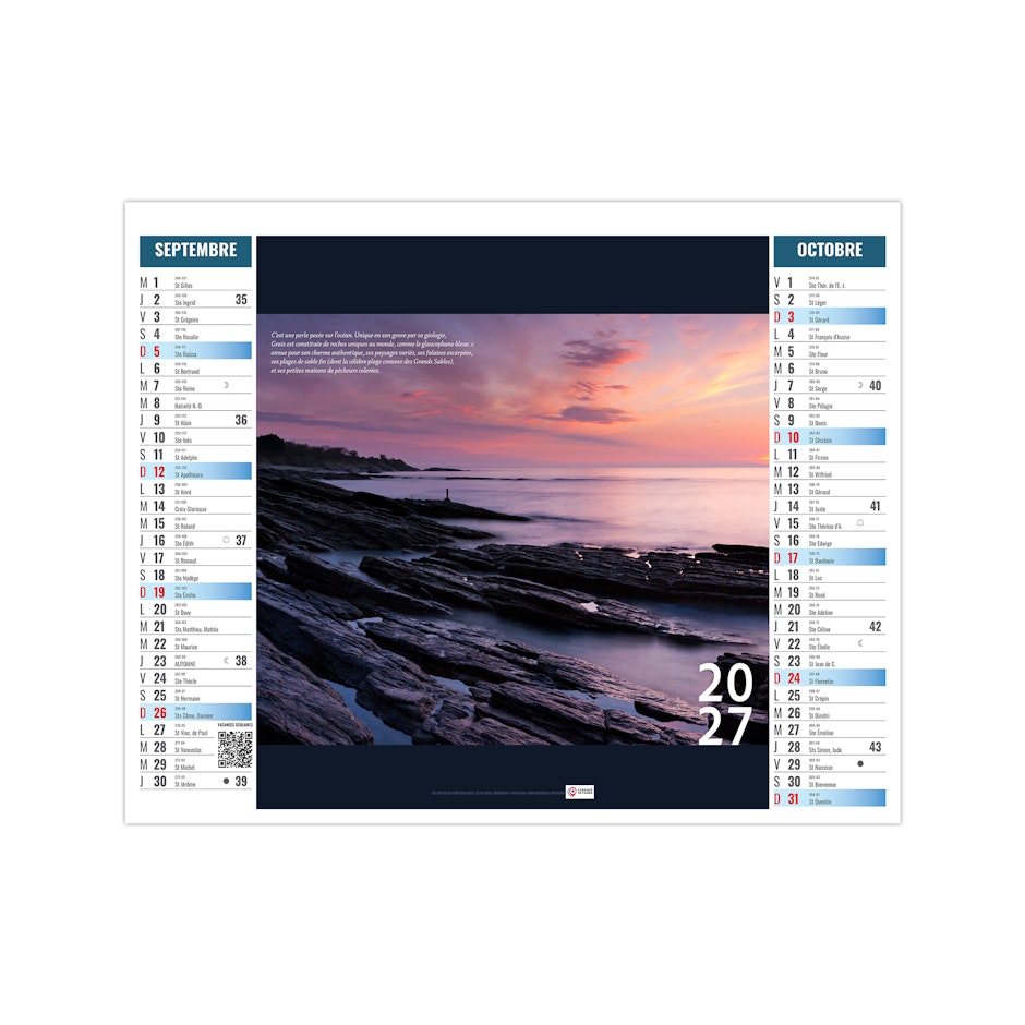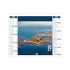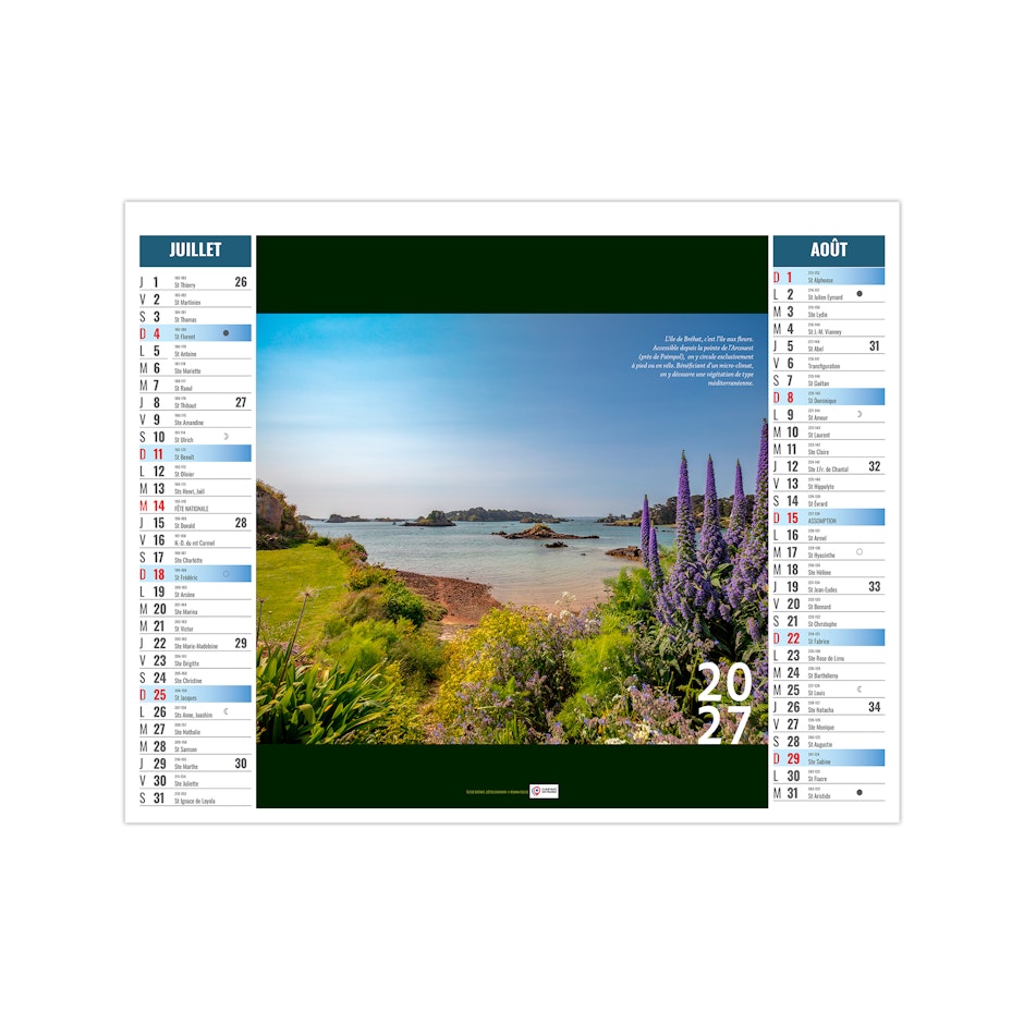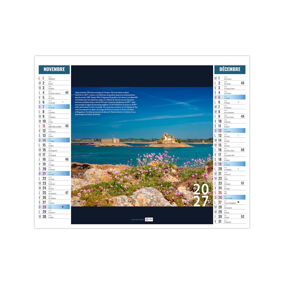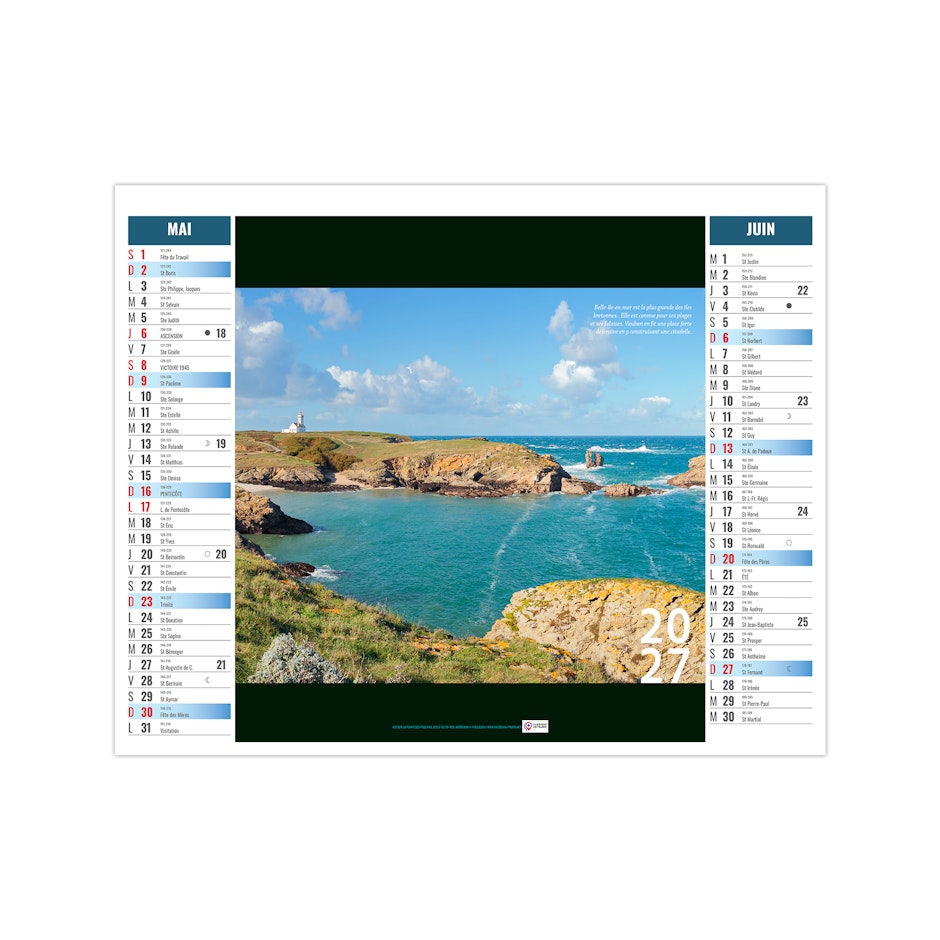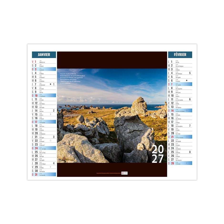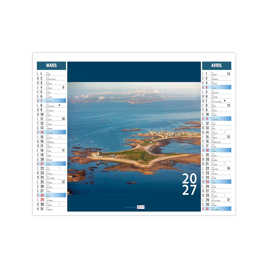 Ce calendrier bancaire est illustré dans sa partie haute de photographies des îles bretonnes. Retrouvez au fil des pages ces petits paradis terrestres. Pratique, ce calendrier se replie pour la mise sous pli. Photographies yvesduval-photo.net et © Ronan Follic.