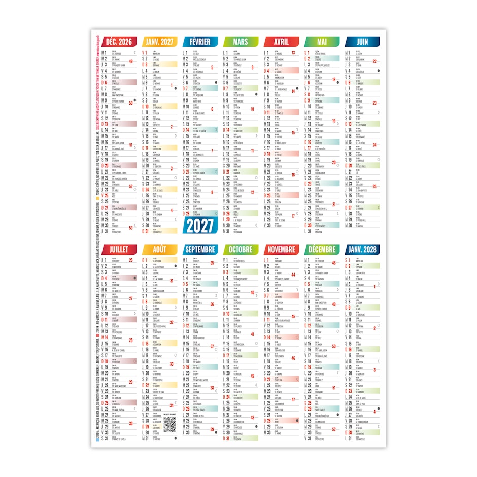 Calendrier 12 mois composé des Saints, n° de semaines, phases lunaires et congés scolaires.