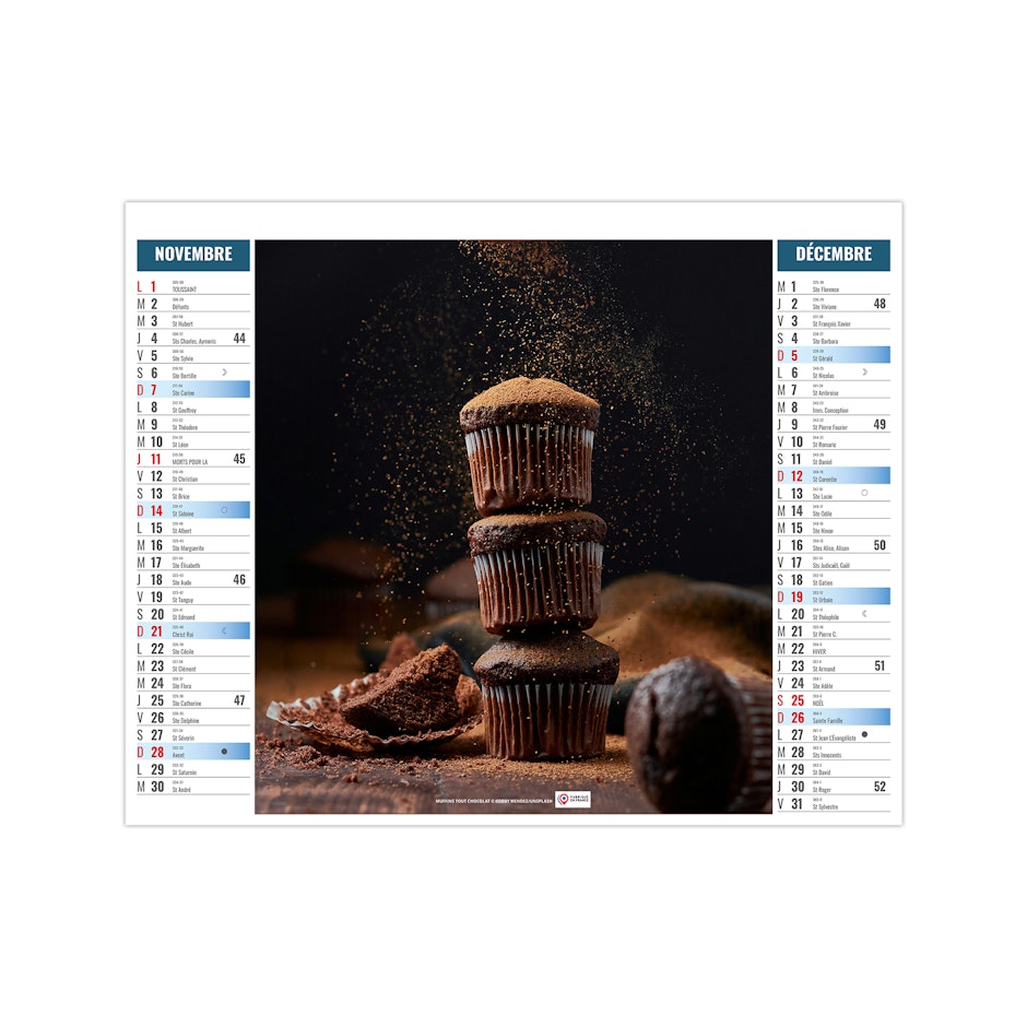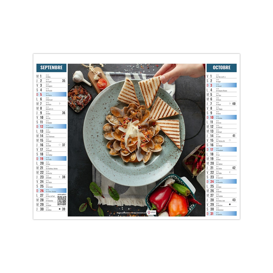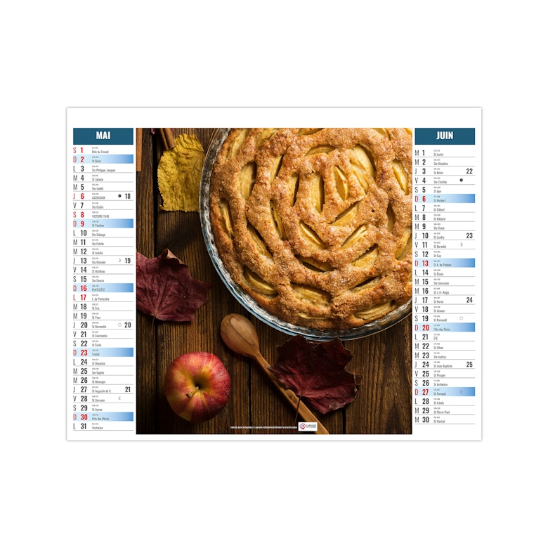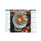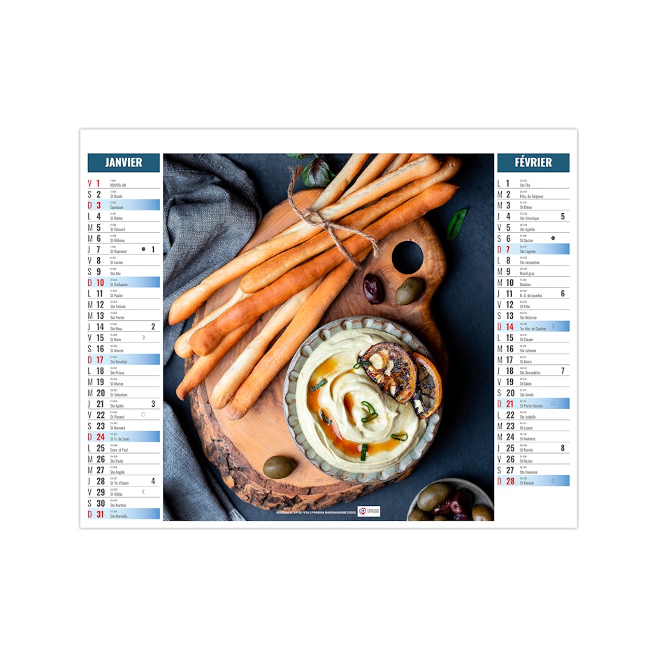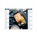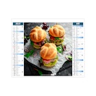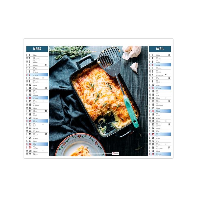 Ce calendrier bancaire est illustré dans sa partie haute sur le thème de la cuisine rapide. Tous les deux mois découvrez une délicieuse recette à partager entre amis. En pied, un calendrier bancaire 12 mois permet de visualiser globalement l'année. Pratique, ce calendrier se replie pour la mise sous pli. Photographies Unsplash - Adobe stock.