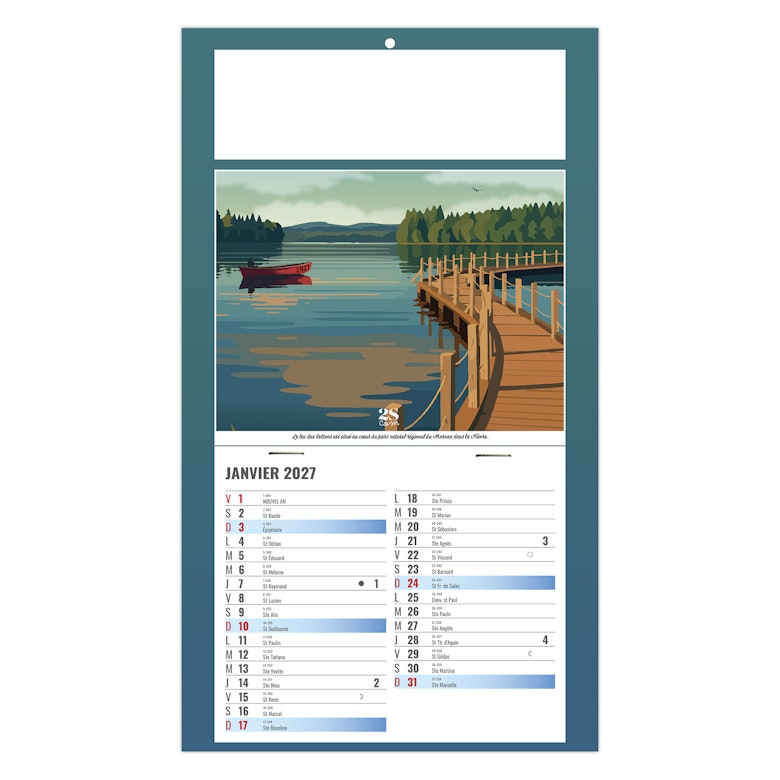 Au choix : Euro Bloc avec les fêtes nationales en 6 langues (D -GB - NL - L - I - E) ou Bloc éphéméride B2, mensuel 12 feuillets agrafés sur dos carton avec grille 2028 en fond. 1 mois par page. La grille est composée des Saints, numéros de semaines, congés scolaires, phases lunaires, compte et décompte journalier.