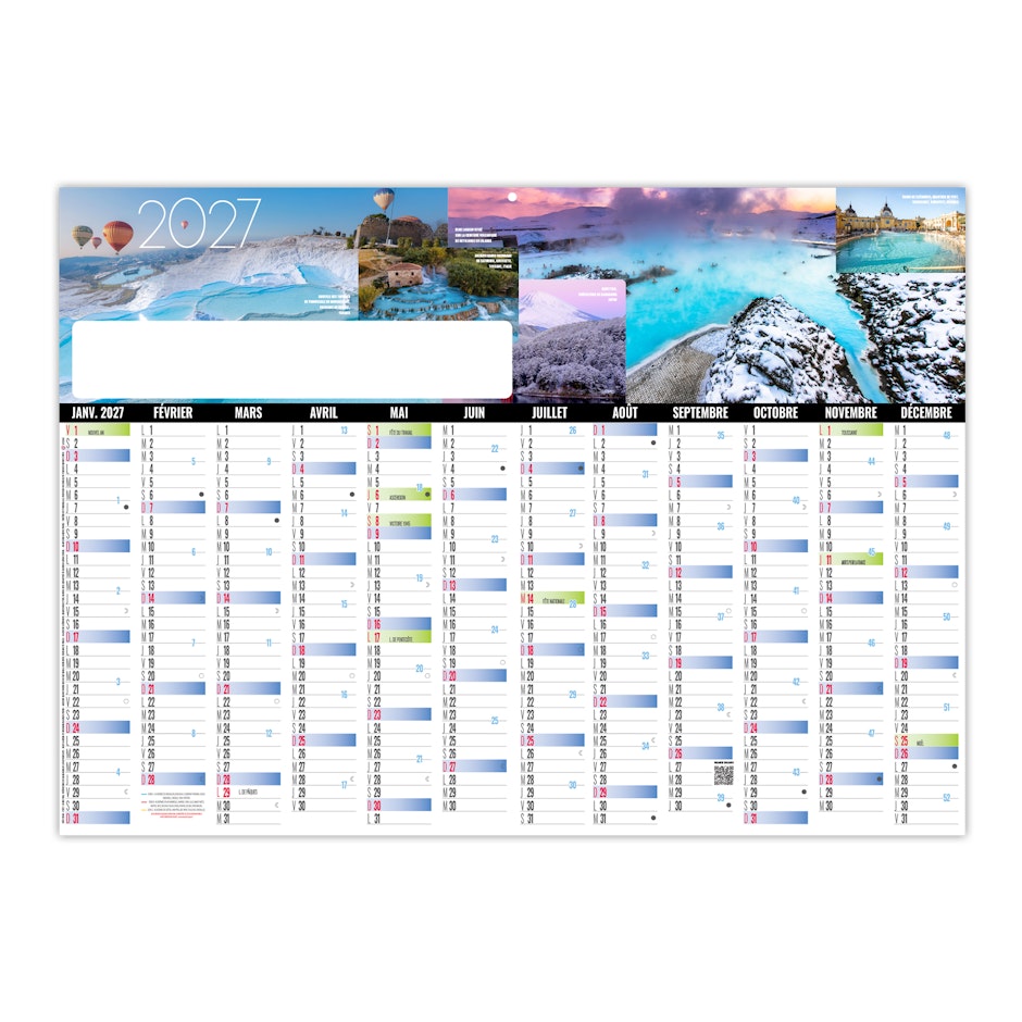 Calendrier planning effaçable illustré d'une mosaïque de photos sur différents sites de thermalisme à travers le monde, dont certains classés au patrimoine mondiale. Photos Adobe stock- Hemis.