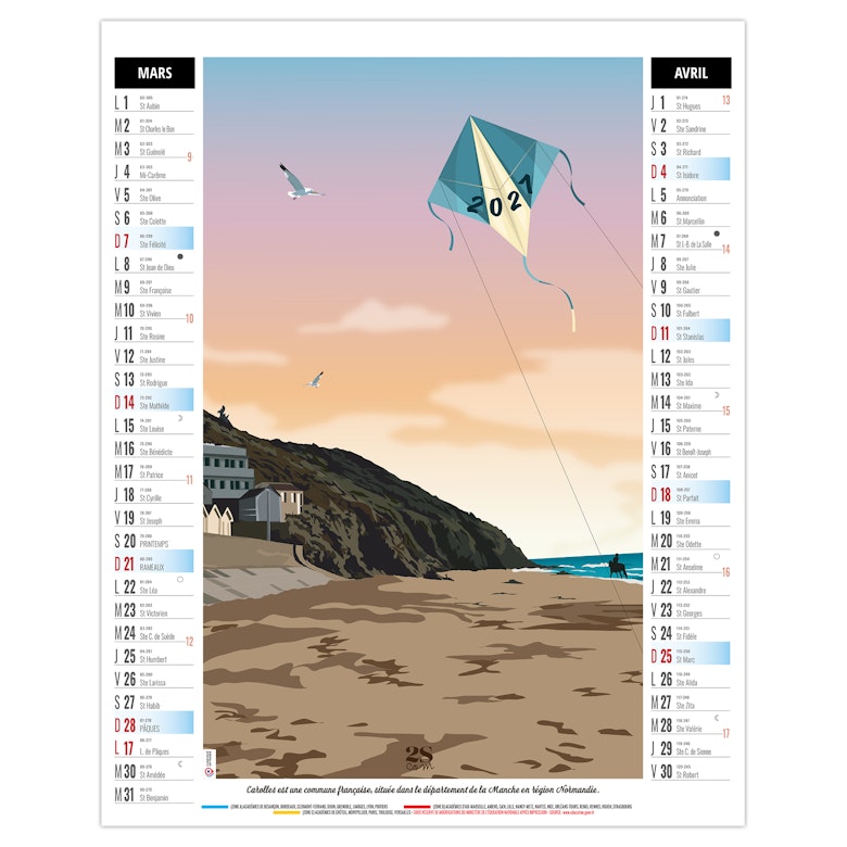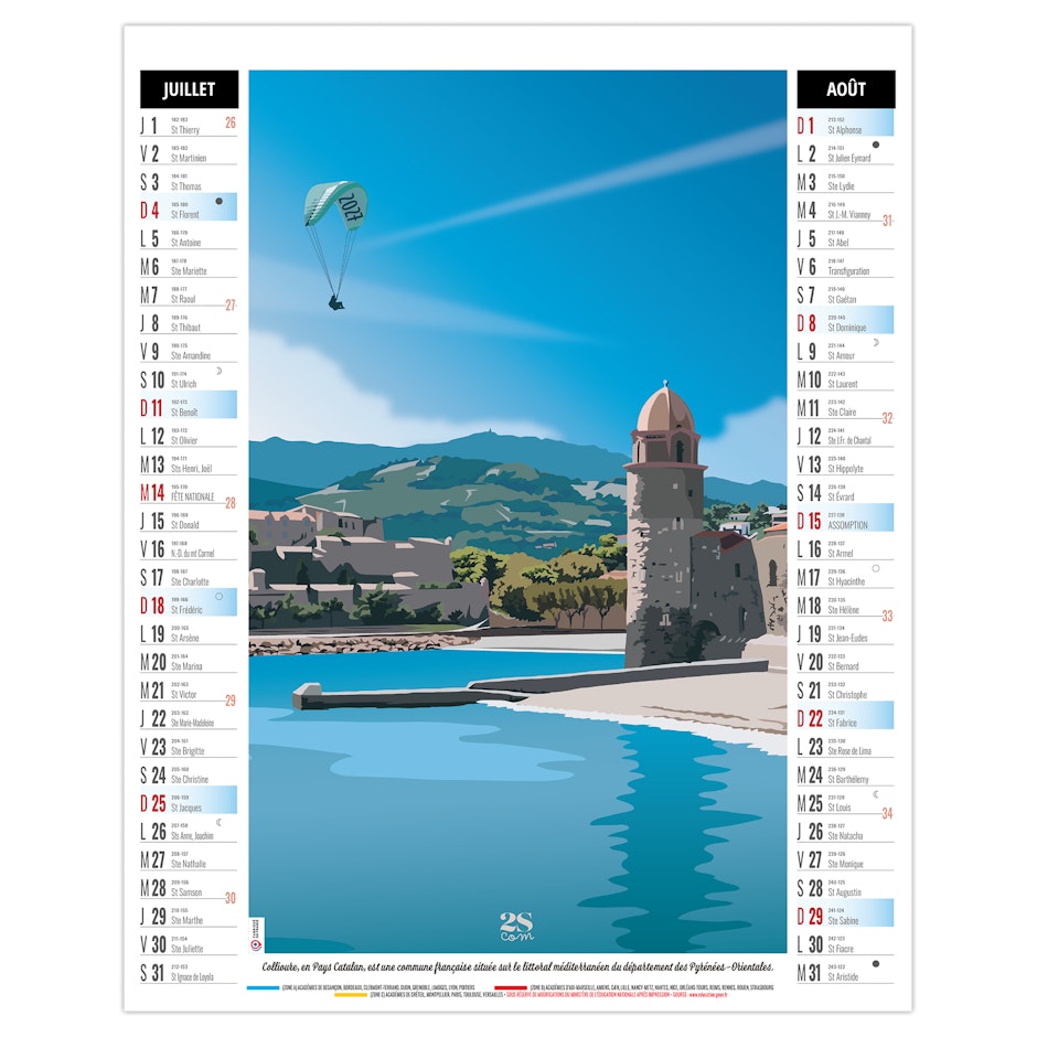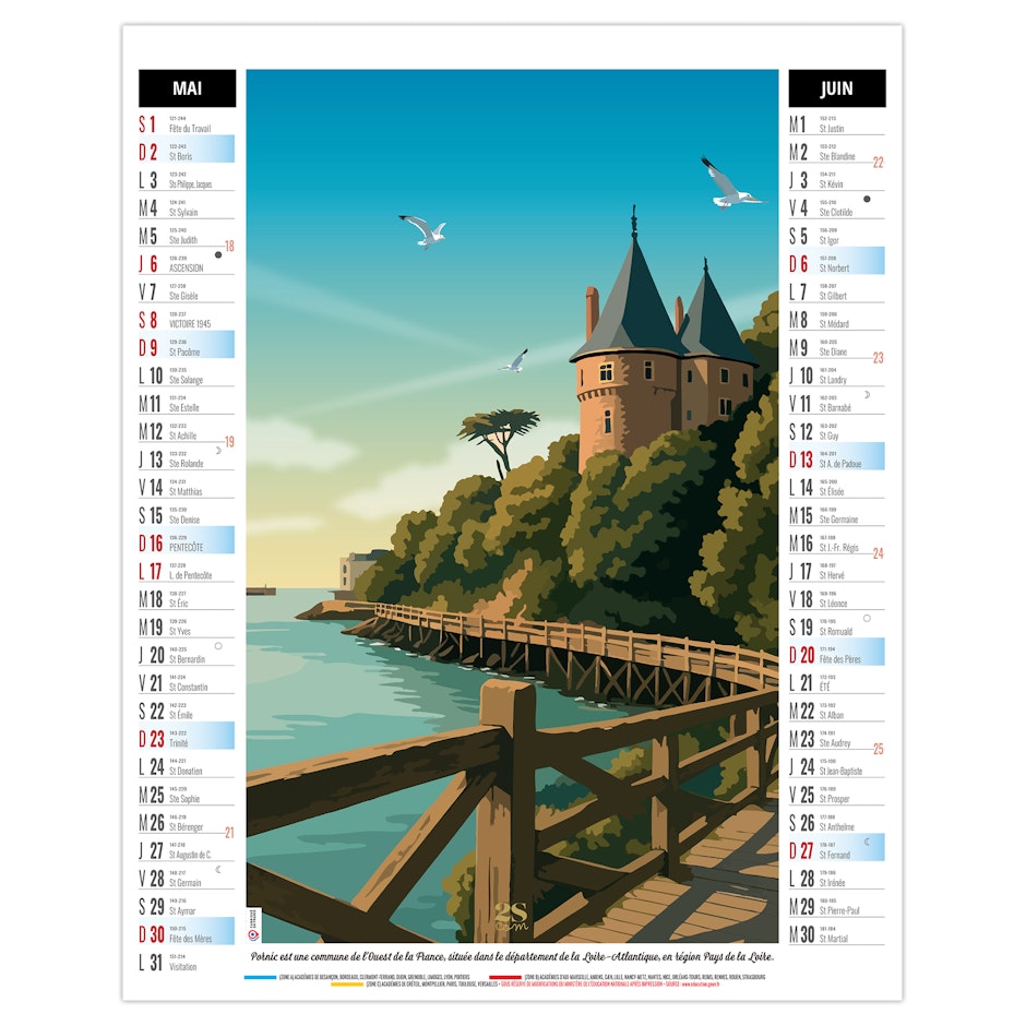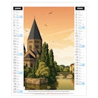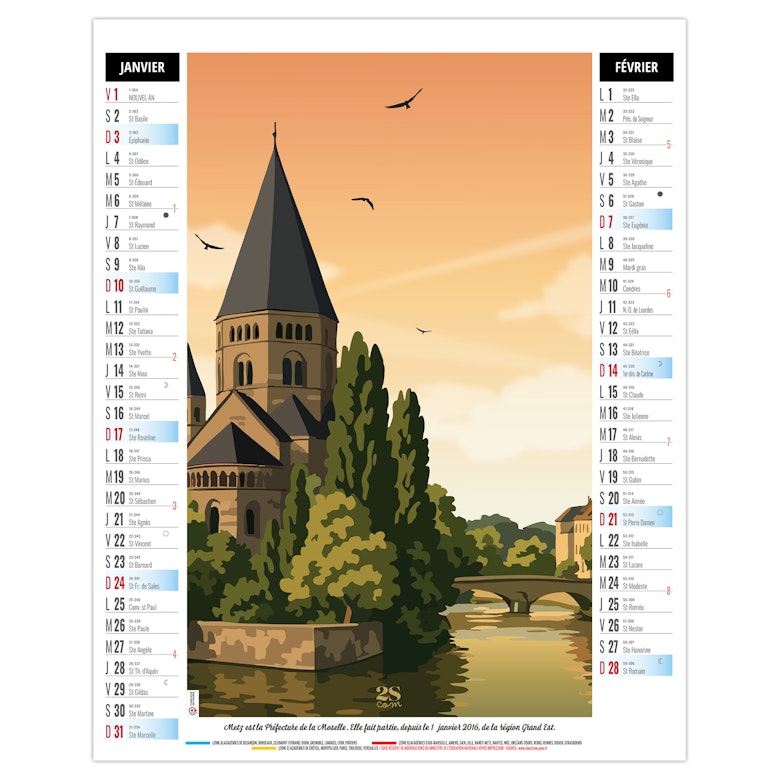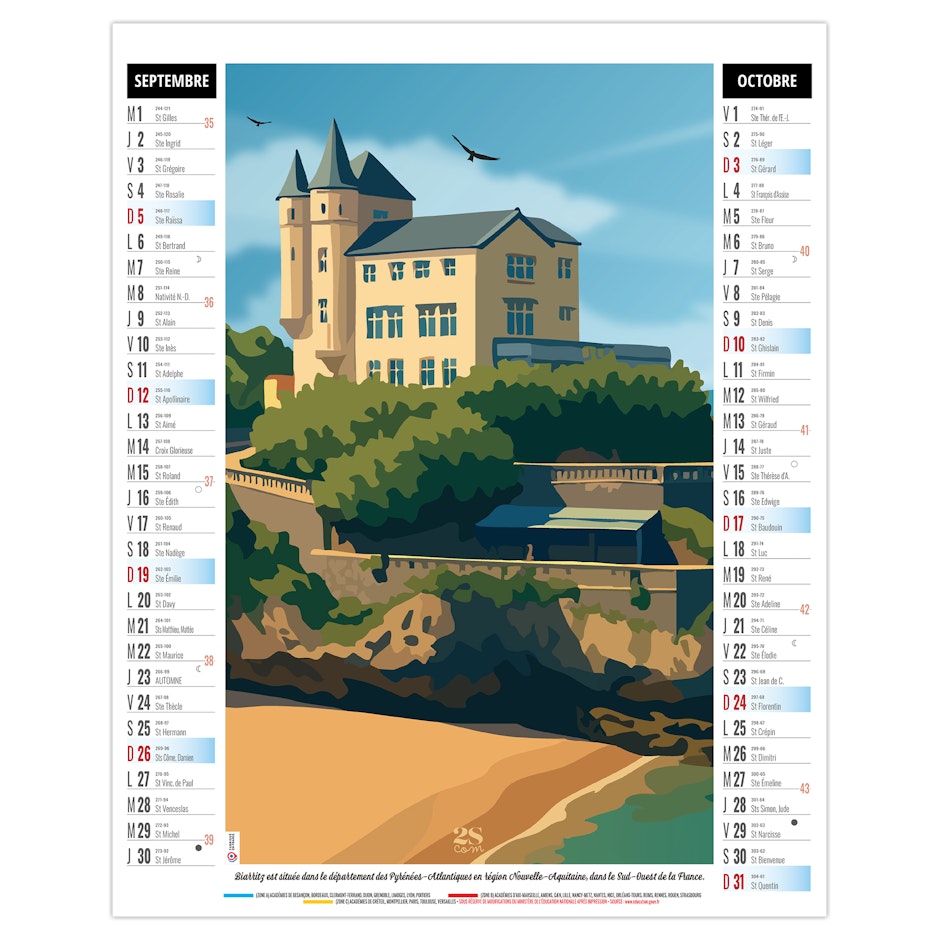Calendrier illustré de 6 illustrations numériques dans le style néo-rétro de Solène Suteau 2SCOM, qui nous fait faire un tour de France des meilleurs spots de vacances, comme Metz, sa cathédrale pour la Moselle - la côte de Carolles en Normandie - Pornic en Loire Atlantique - le lac de Settons dans la Nièvre - Biarritz en Nouvelle Aquitaine - Colioure en pays Catalan.