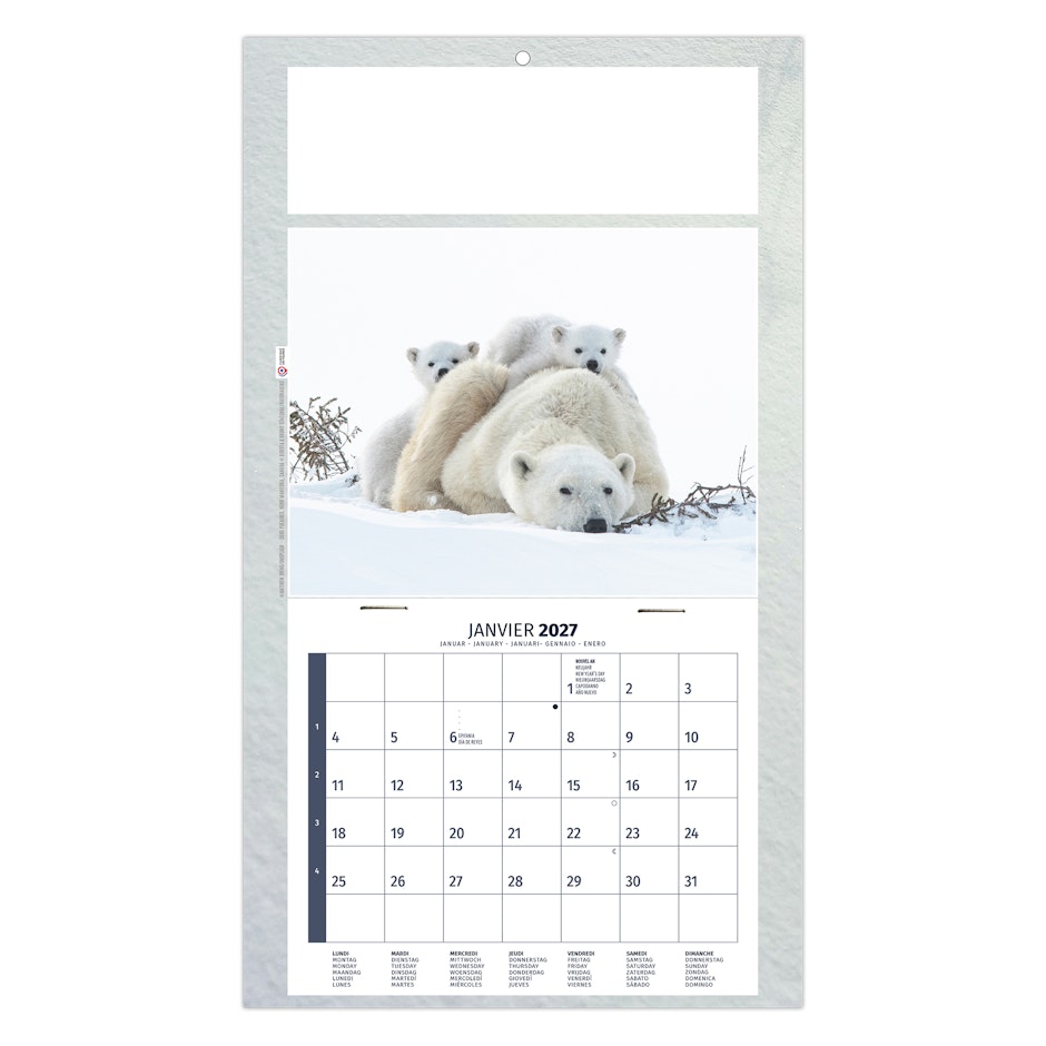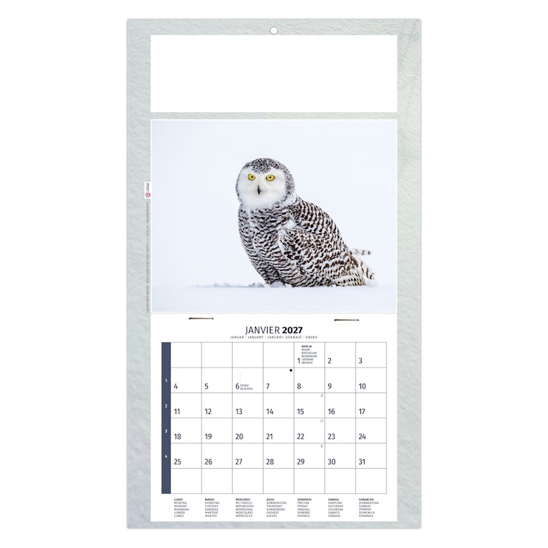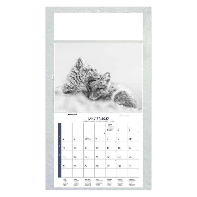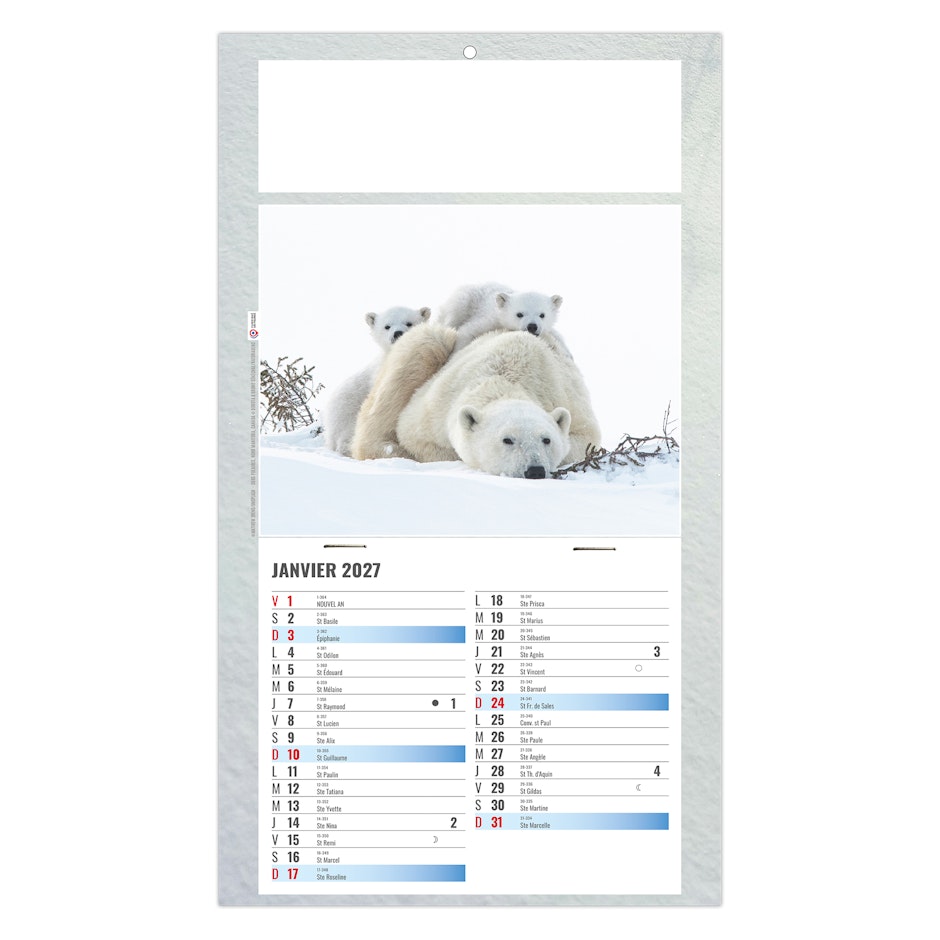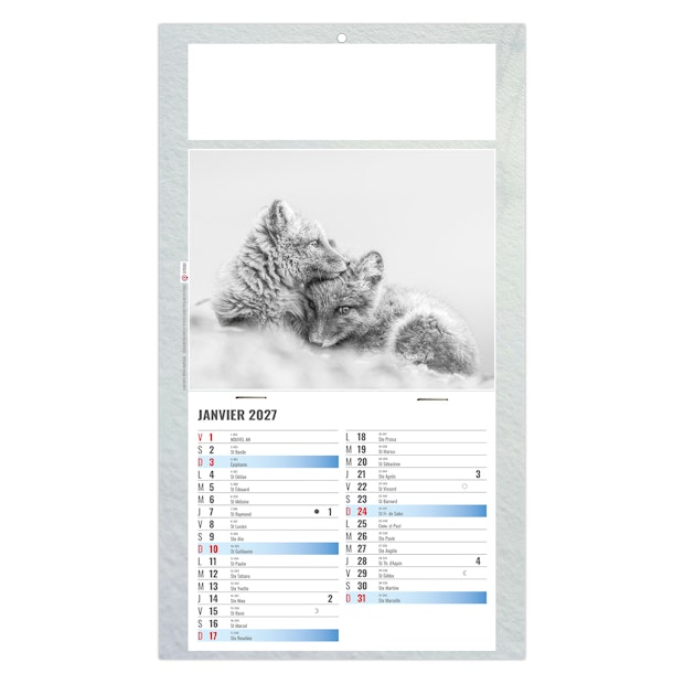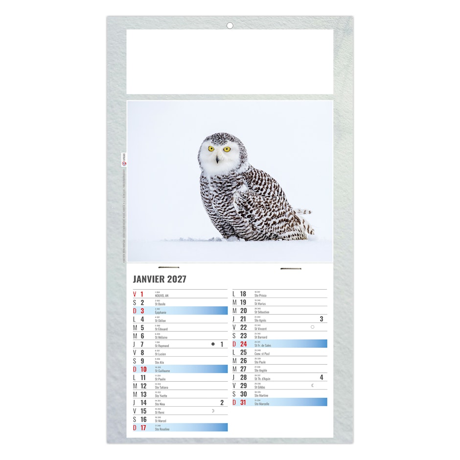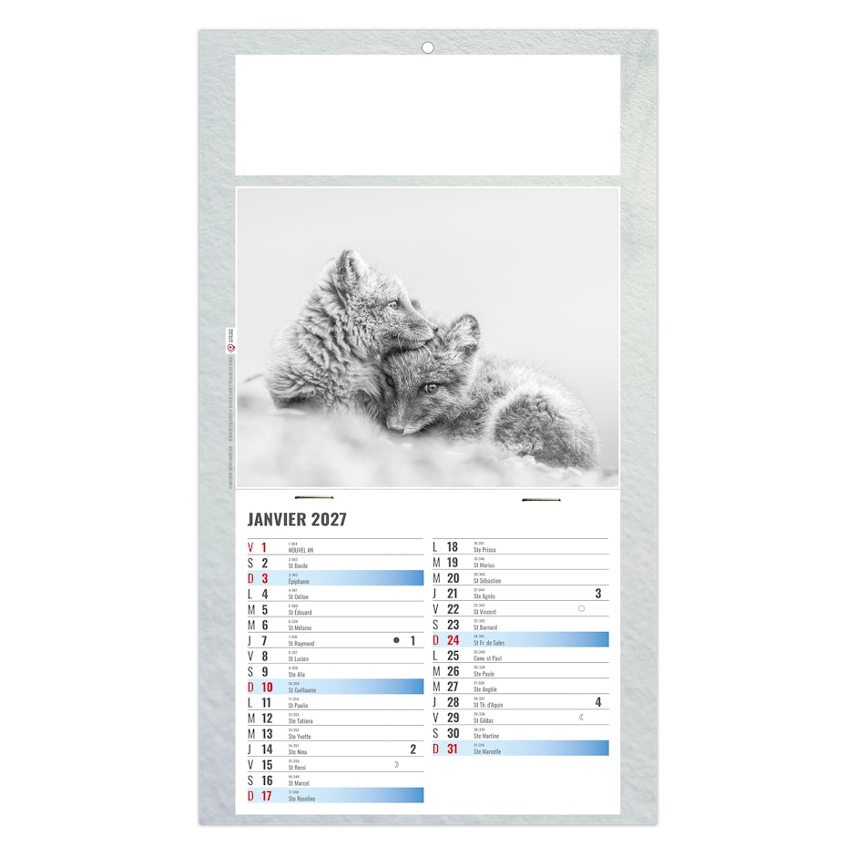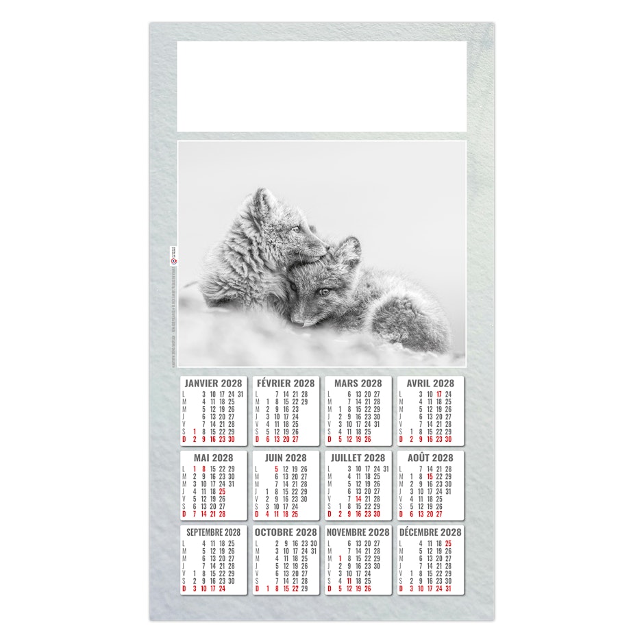 Au choix : Euro Bloc avec les fêtes nationales en 6 langues (D -GB - NL - L - I - E) ou Bloc éphéméride B2, mensuel 12 feuillets agrafés sur dos carton avec grille 2028 en fond. 1 mois par page. La grille est composée des Saints, numéros de semaines, congés scolaires, phases lunaires, compte et décompte journalier.