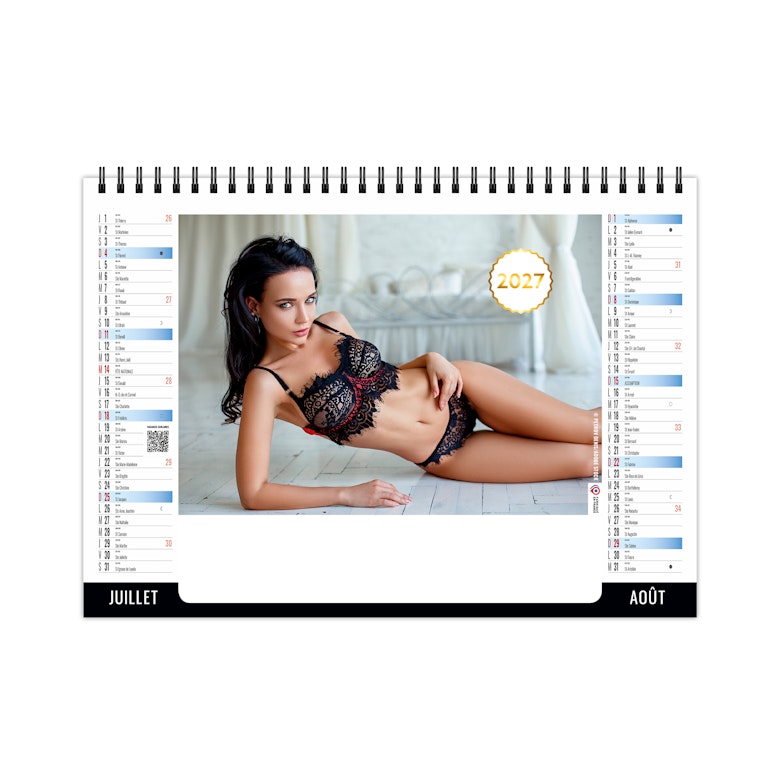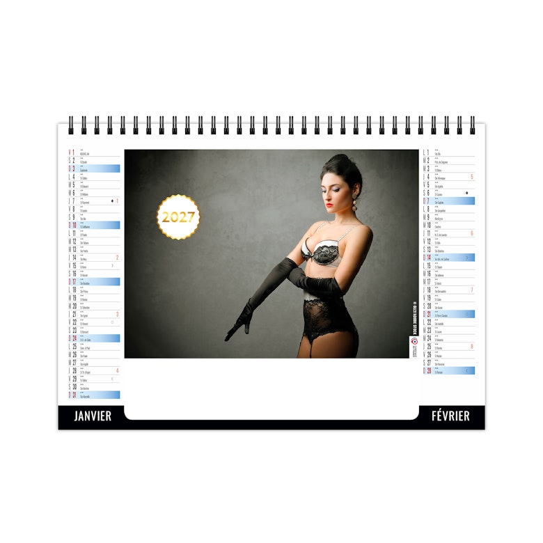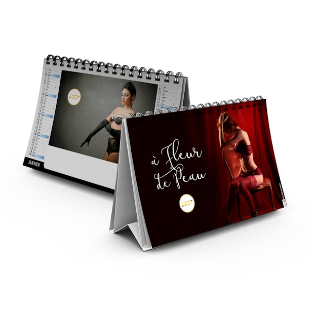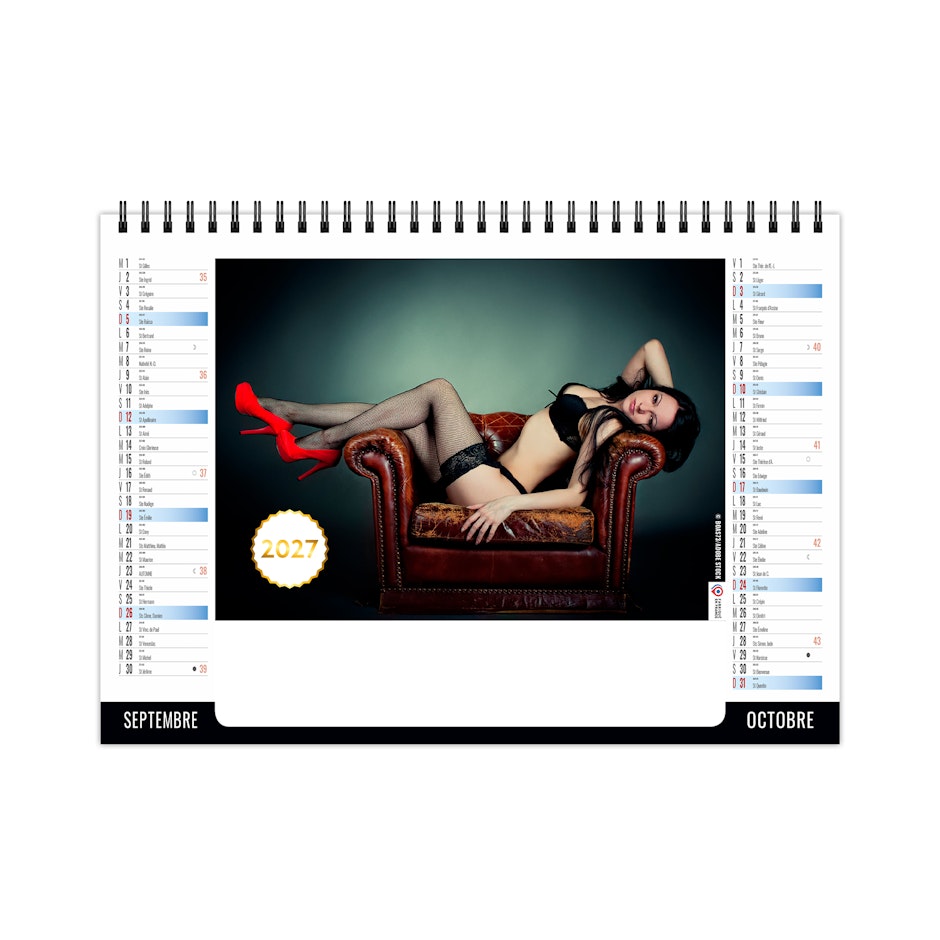 Chevalet de bureau illustré de 6 photos de femmes légèrement vêtues de tenues sexy constituées de satin et de dentelles. Dessous chics vous dévoilent toute l'esthétique de corps sublimés par des dessous ajustés, qui d'un bustier, de porte-jarretelles ou de soutien-gorge pigeonnant. Photographies Adobe stockphotos.