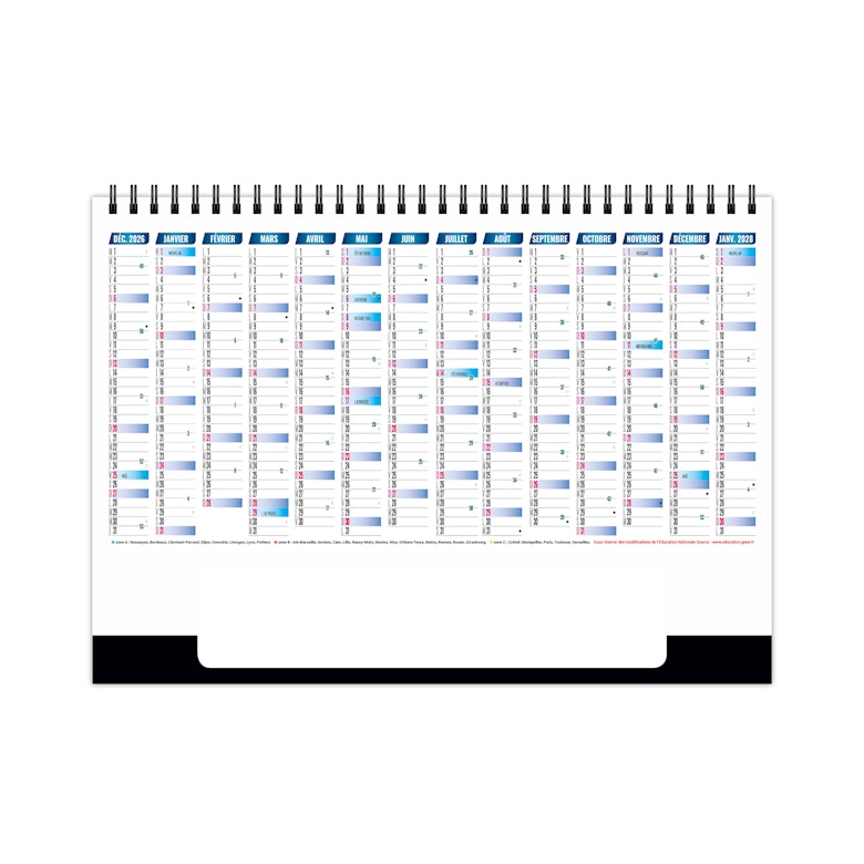 2 mois par feuillet. La grille comprend les numéros de semaines. Les congés scolaires sont sur le verso du 7ème feuillet.