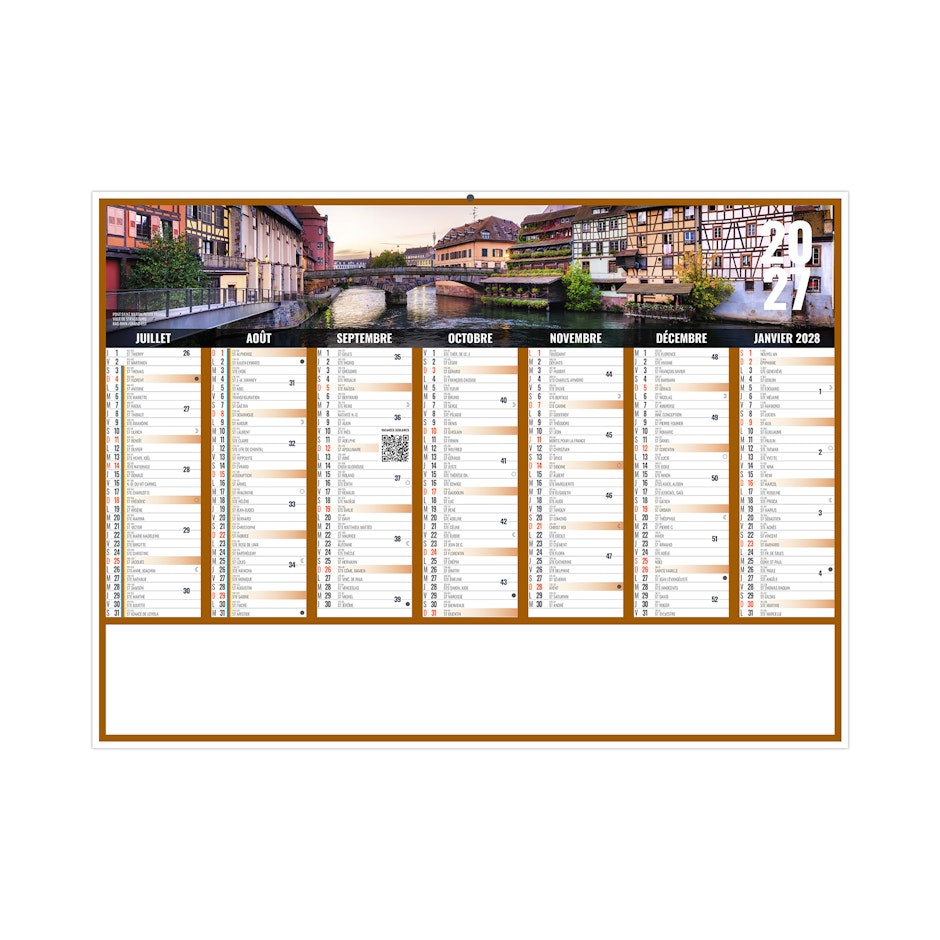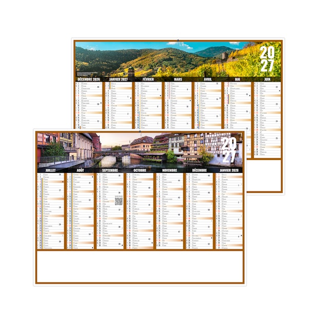 Vous aimez l'Alsace ? Alors venez découvrir notre modèle de calendrier bancaire publicitaire 2027 Liberté Grand-Est, nous vous enmenons découvrir le pont Saint-Martin de la Petite France à Strasbourg ou découvrir les monts Vosgiens avec son vignoble aux couleurs automnales. Photographies d'Hervé Sentucq.