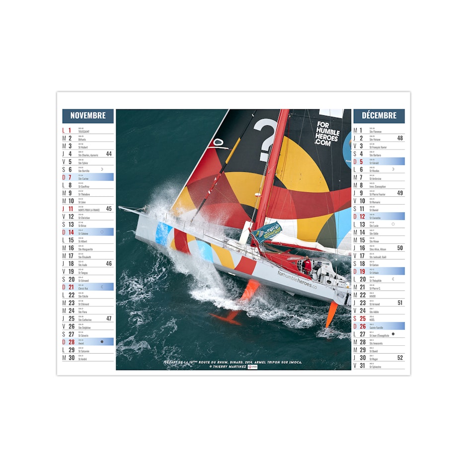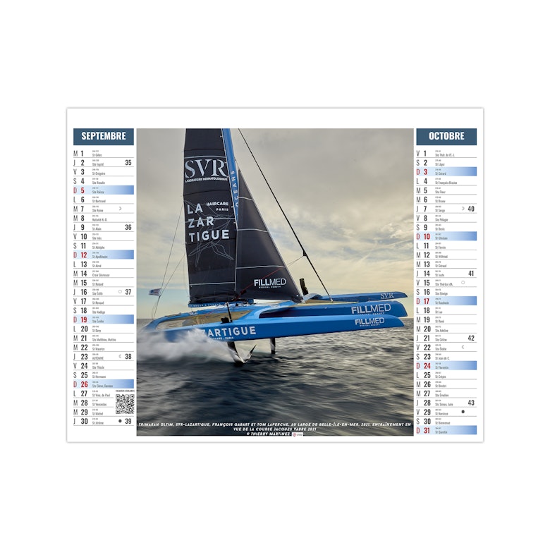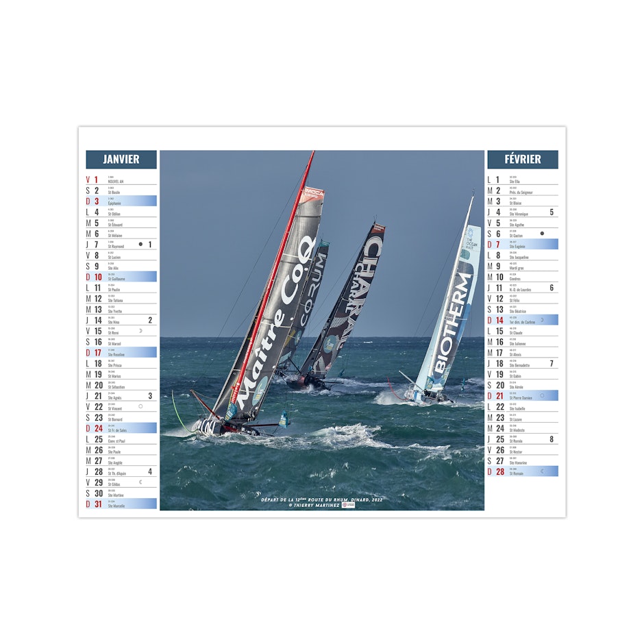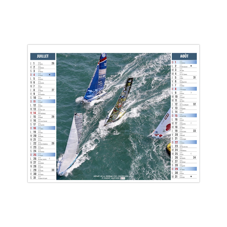 Ce calendrier bancaire est illustré dans sa partie haute sur le thème de la voile sportive. Montez à bord des monocoques et trimaran qui ont marqués les grandes courses au large en solitaire ou par équipe. Pratique, ce calendrier se replie pour la mise sous pli. Photographies Thierry Martinez.