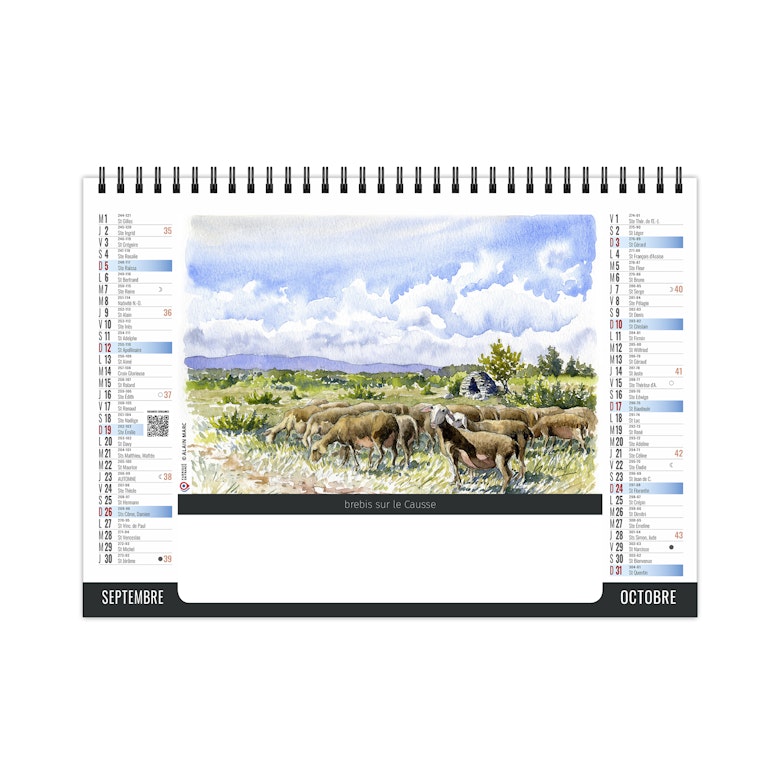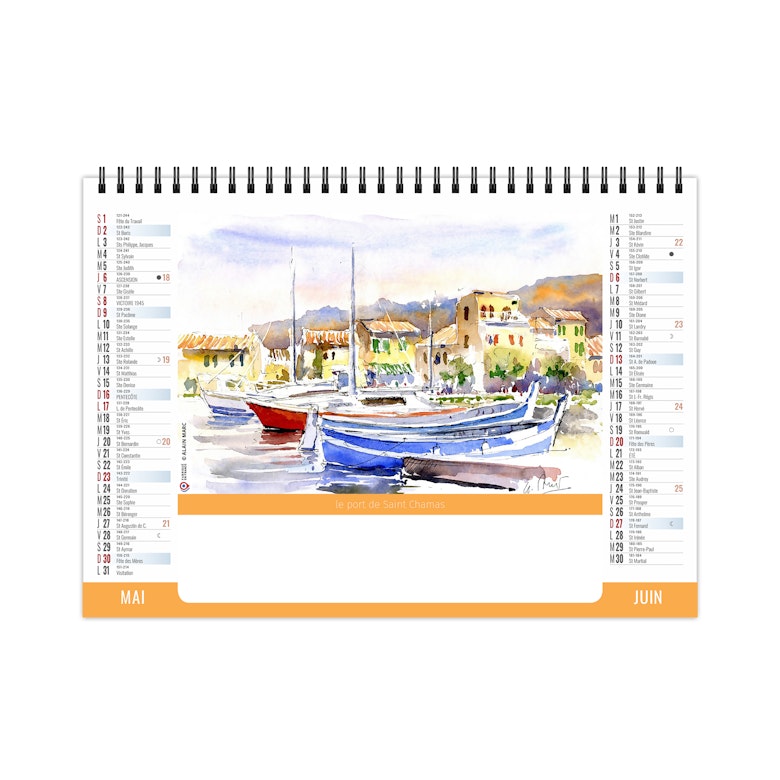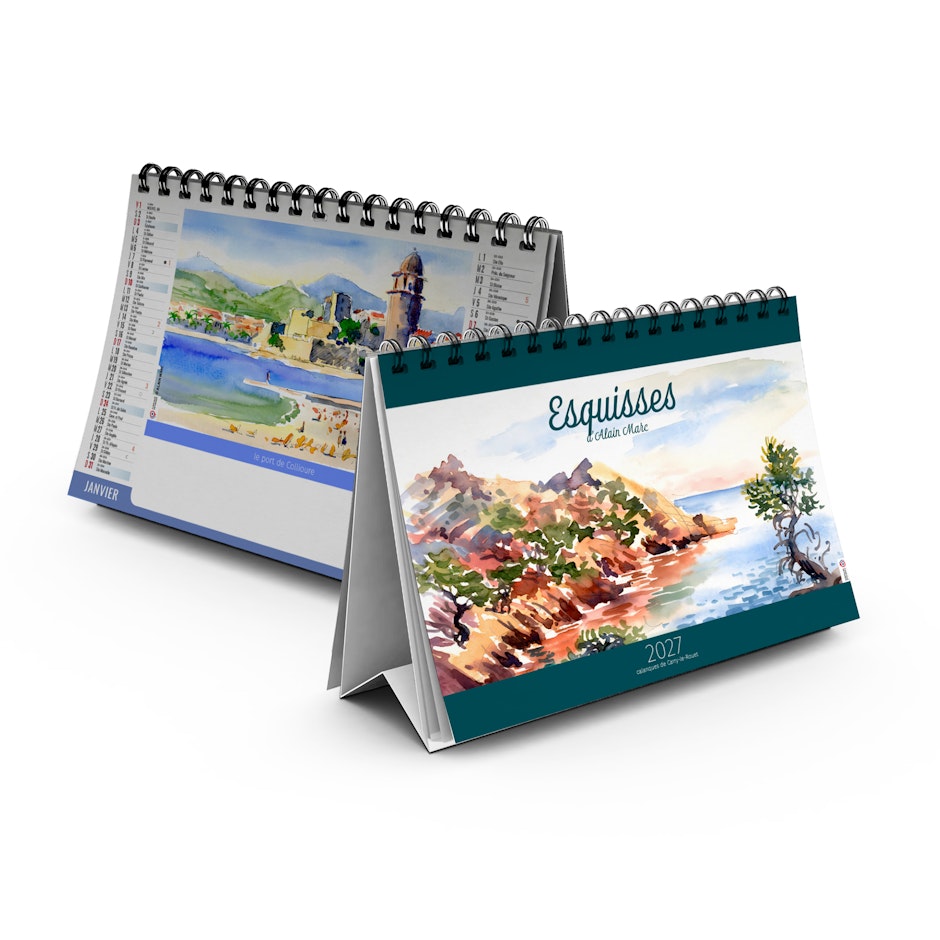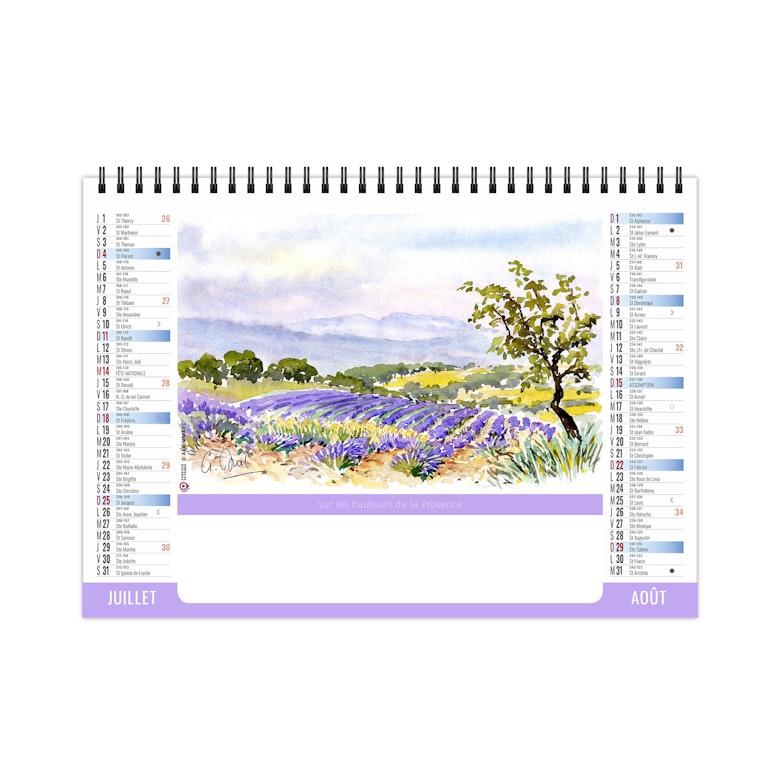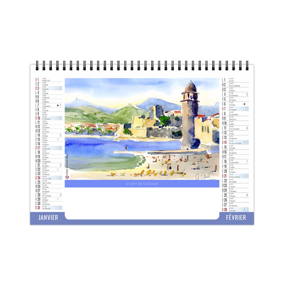 Calendrier illustré d'aquarelles d'Alain Marc qui a choisit pour thème des paysages provençaux - calanques, champs de lavande, vieux port de St Chamas, Collioure. partez à la découverte du pourtour méditerranéen avec une palette haute en couleur.