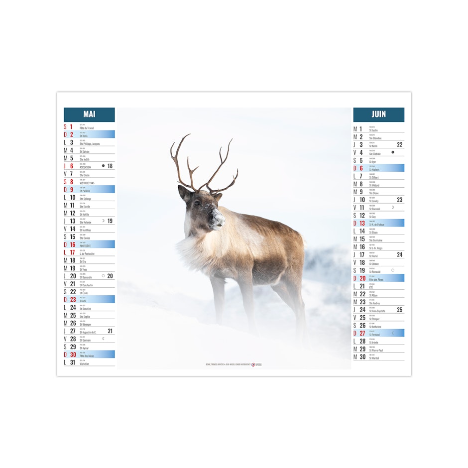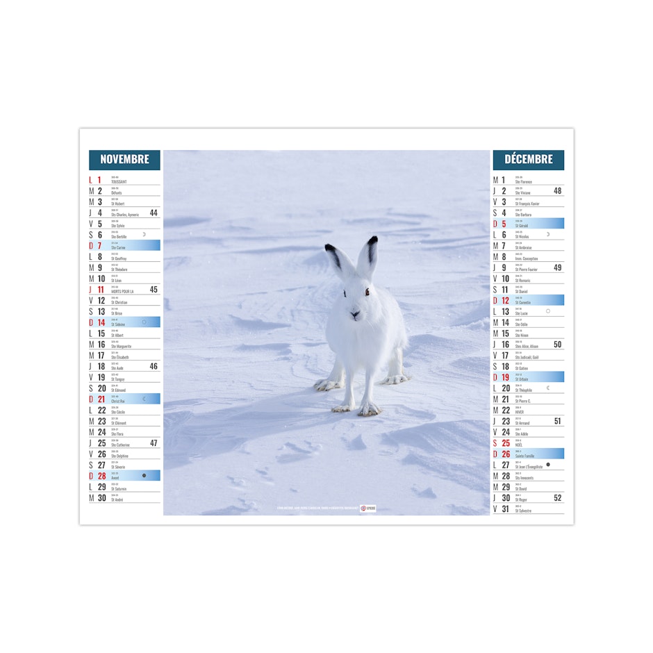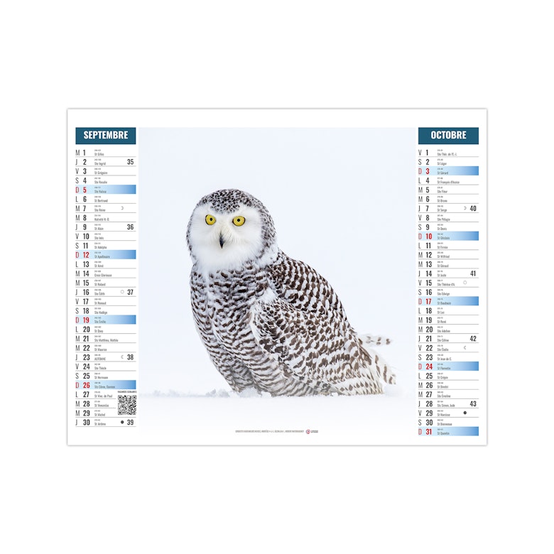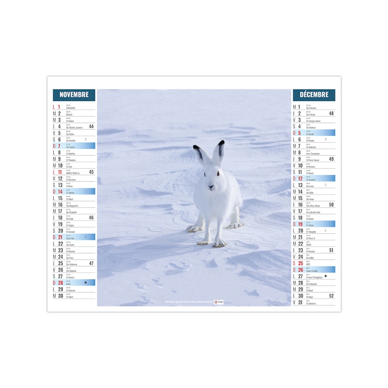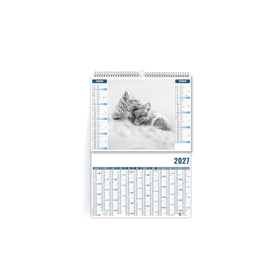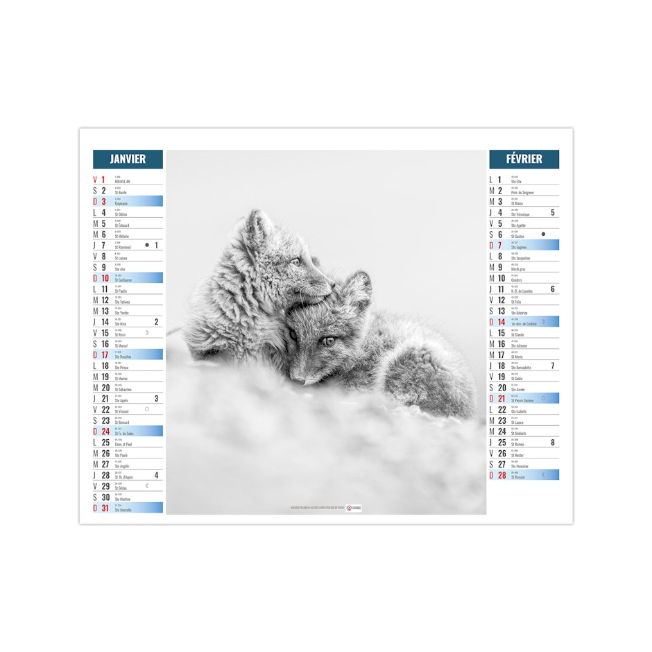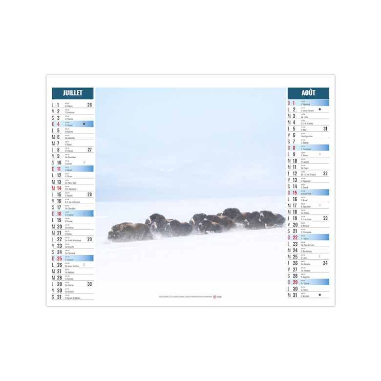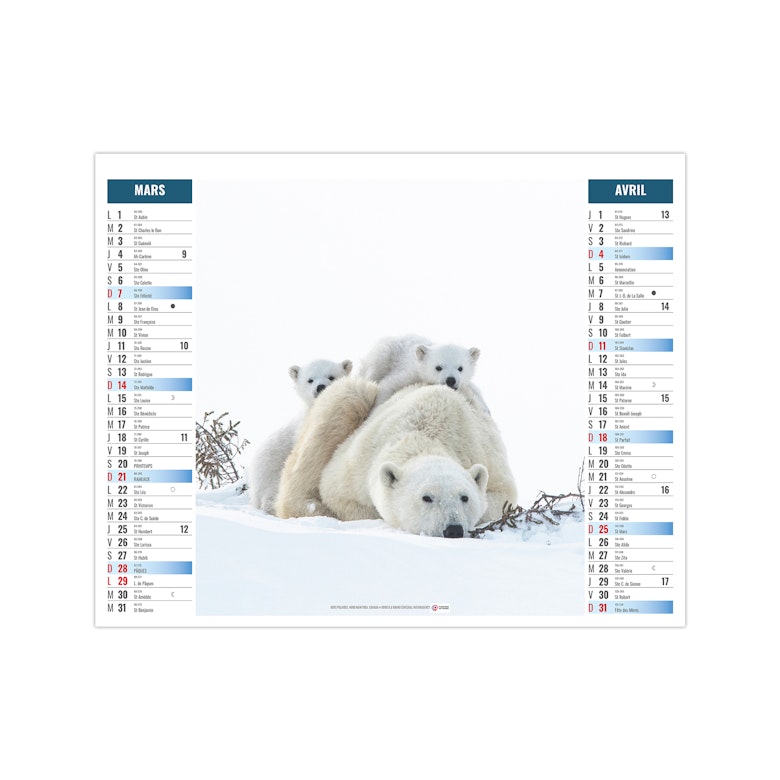 Ce calendrier bancaire est illustré dans sa partie haute sur le thème de l'Arctique et des animaux qui y vivent, comme les manchots Adélie, l'ours polaire, le renard arctique ou encore le boeuf musqué. Pratique, ce calendrier se replie pour la mise sous pli. Photographies Olivier Larrey/Regard du vivant - Naturagency