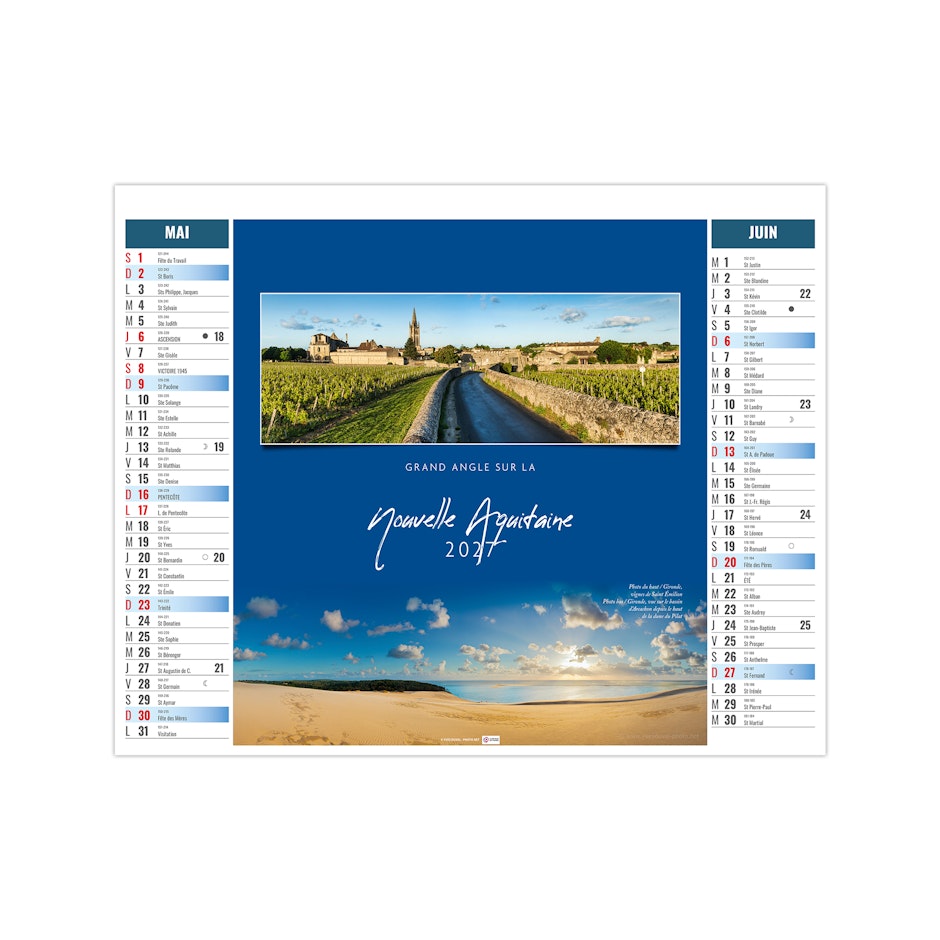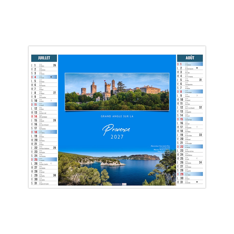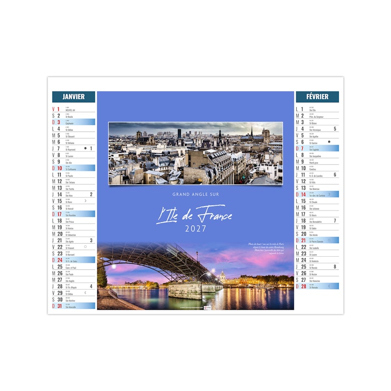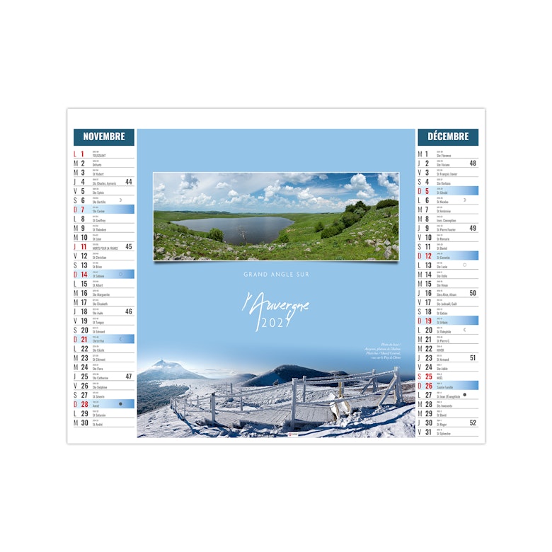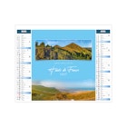 Ce calendrier bancaire est illustré dans sa partie haute sur le thème des paysages de France. Tous les deux mois, découvrez la richesse du territoire français. Pratique, ce calendrier se replie pour la mise sous pli. Photographies Hervé Sentucq et Yves Duval.