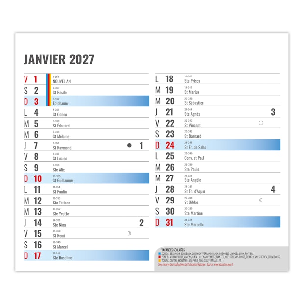 La grille calendaire comprend les Saints, le compte et décompte journalier, numéros de semaines, phases lunaires, congés scolaires.