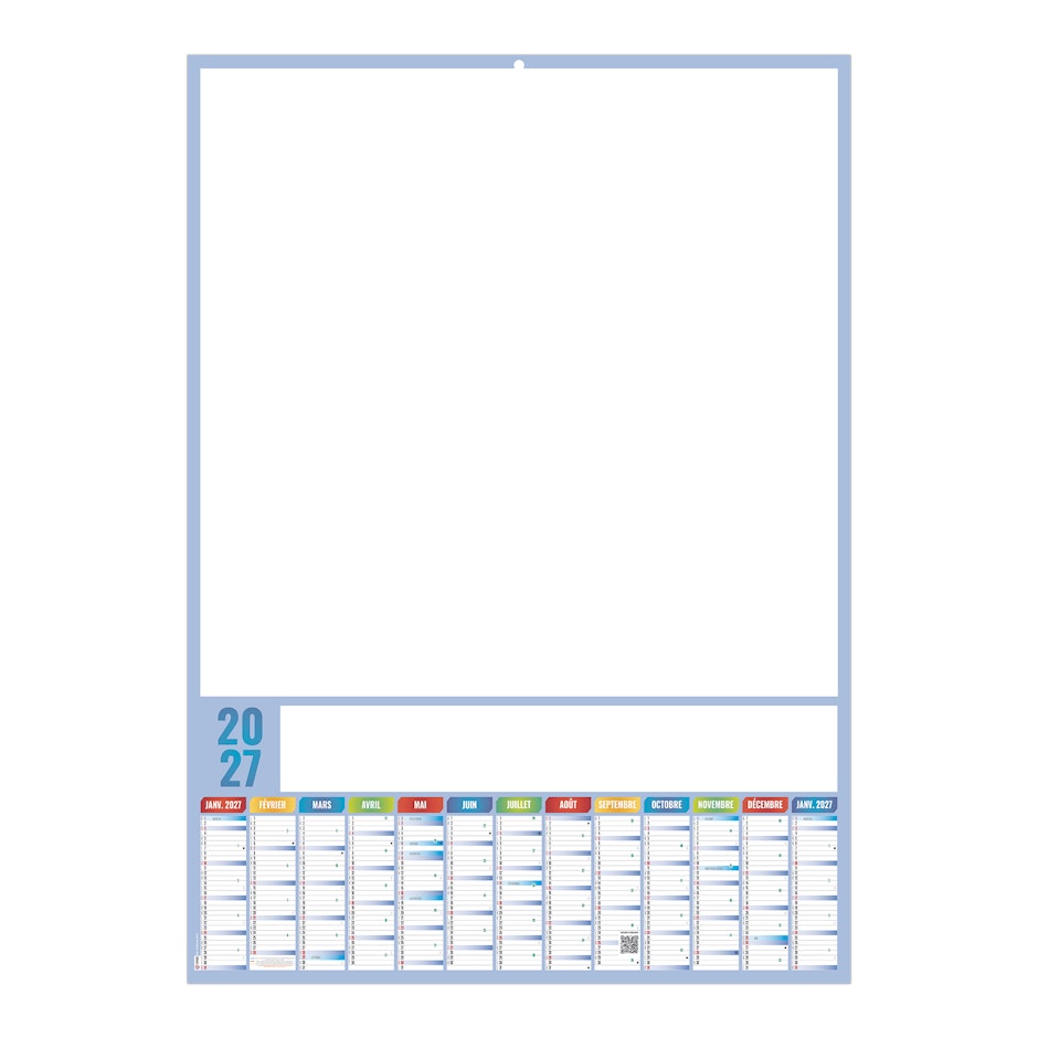 13 mois sur une face. La grille comprend les numéros de semaines, phases lunaires, et les congés scolaires et une vaste zone d'écriture. Le recto est entièrement effaçable.