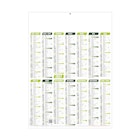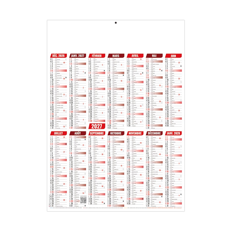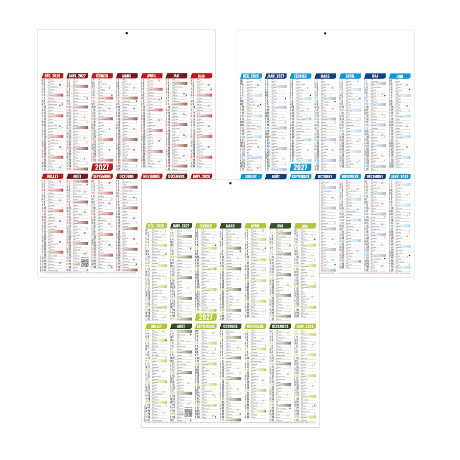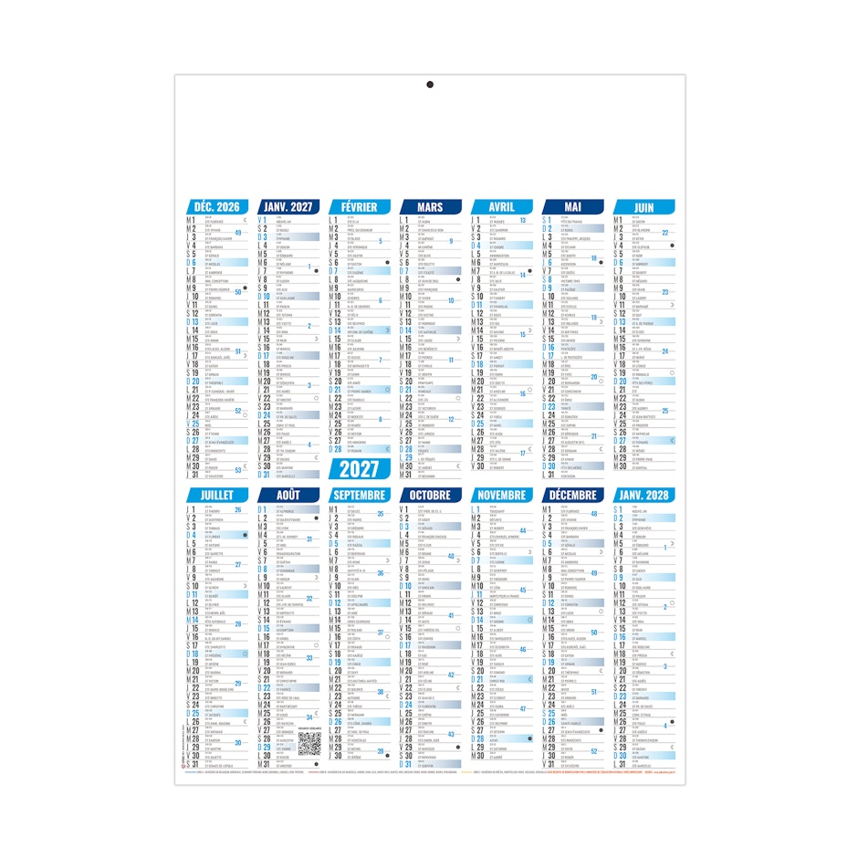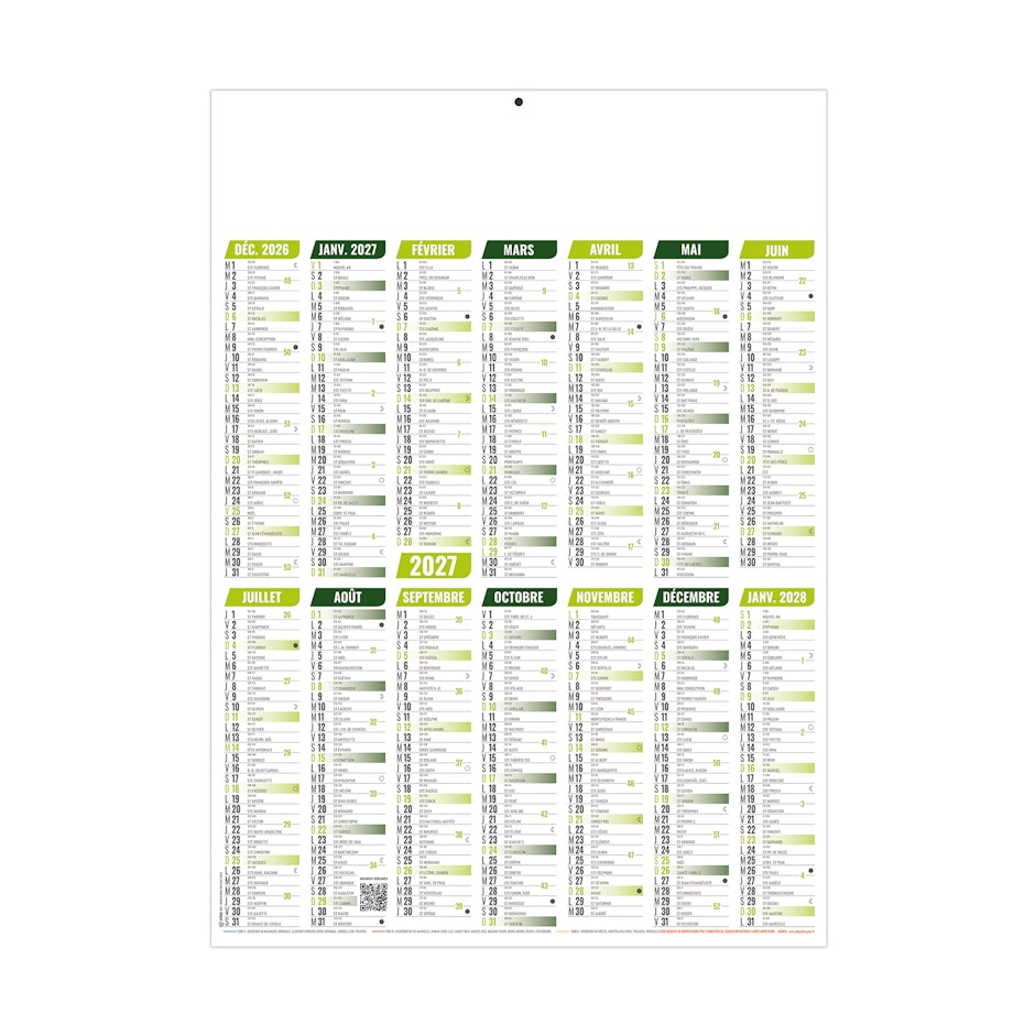 14 mois au recto. La grille comprend les Saints, n° de semaines, phases lunaires, congés scolaires et le compte et décompte journalier. Au verso pour les STANDARDS verso vierge ou 9 thèmes au choix répiquables : Numéros d'urgence /  France routière / France régionale / France Europe / dos Vins / dos Epices / dos Corse / dos Écogestes / dos Eaux thermales.