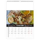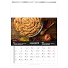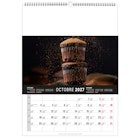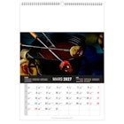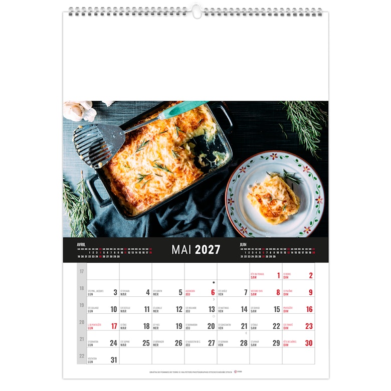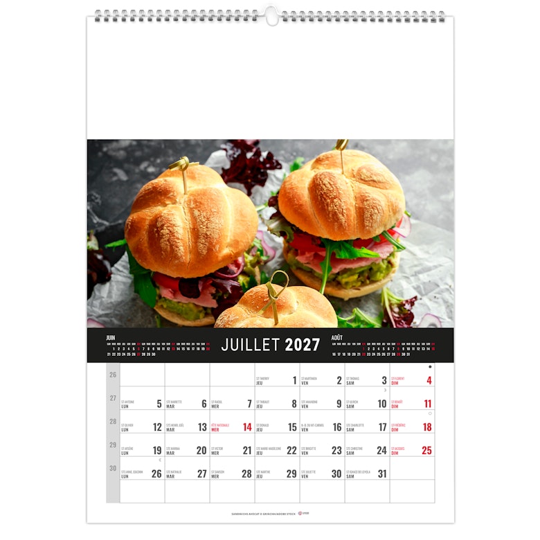 Calendrier 12 feuillets : 1 mois par page et 1 visuel par mois. Grille américaine, avec le mois précédent et le mois suivant sur le feuillet. Phases lunaires, fêtes et congés scolaires.
