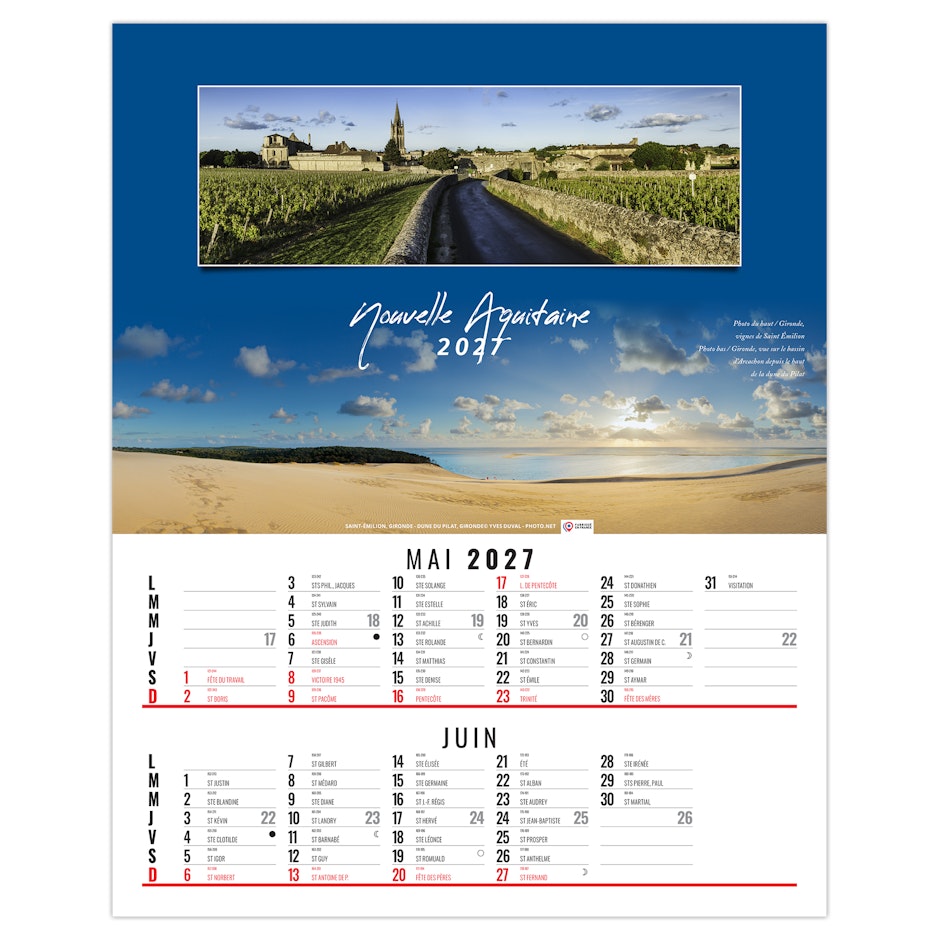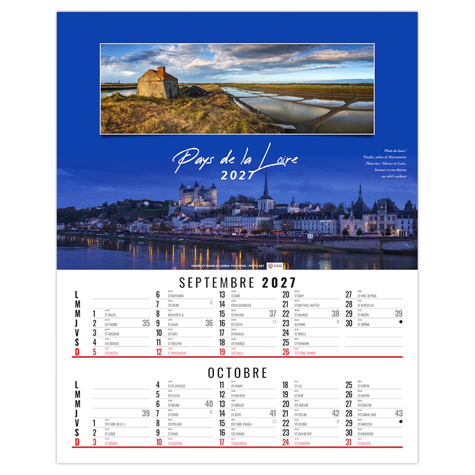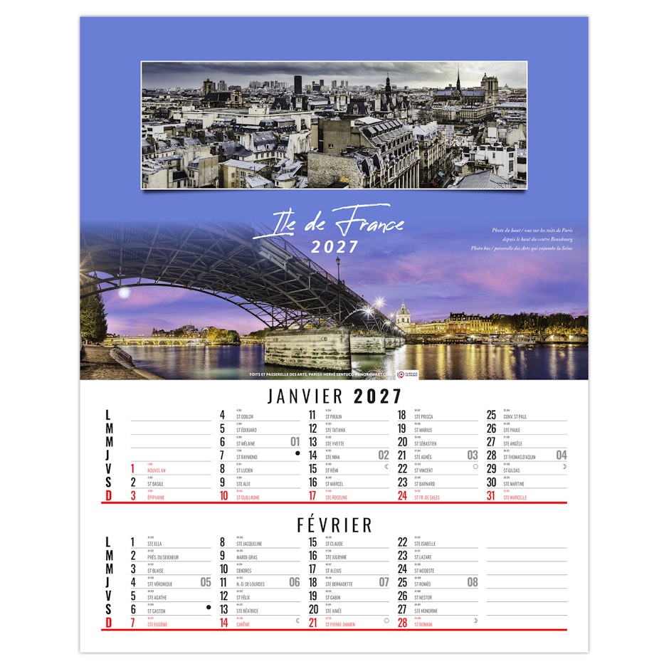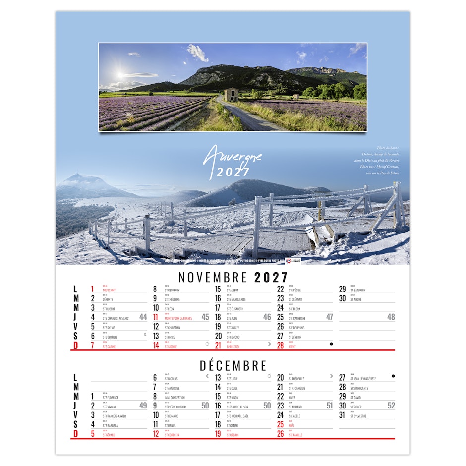 La grille calendaire est composée des Saints, numéros de semaines, phases lunaires, congés scolaires et le compte et décompte journalier. Plus grille 2028 sur dos carton.