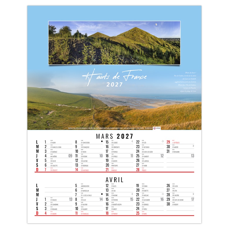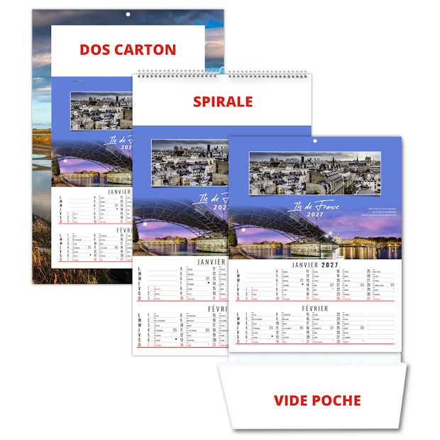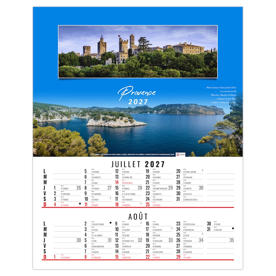 Calendrier illustré de 6 doubles vues panoramiques de sites touristiques français réalisées par Hervé Sentucq et Yves Duval. Ce calendrier bloc illustré existe également en dos-carton, dos vide-poche et calendrier spirale.
