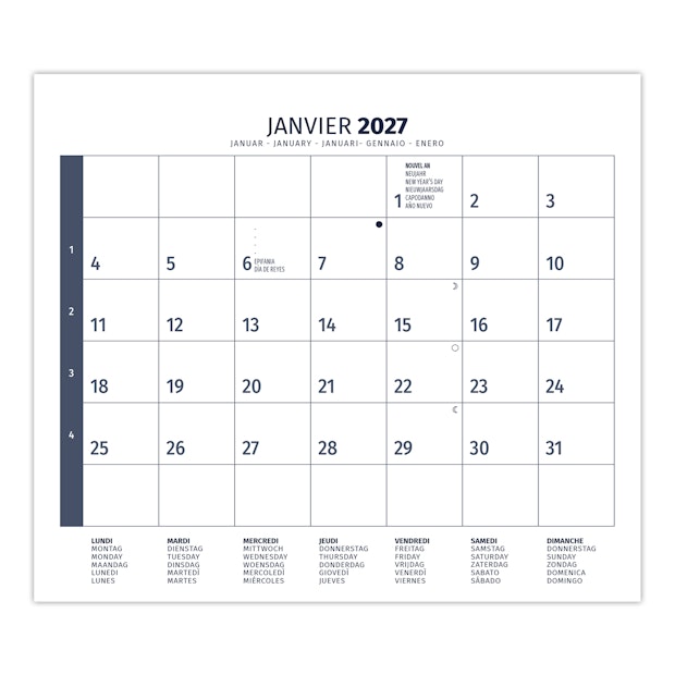 La grille américaine pour écriture comprend les jours fériés pour chaque pays (Fr- D- GB - NL - IT - E) en fonction des mois, numéros de semaines, phases lunaires.