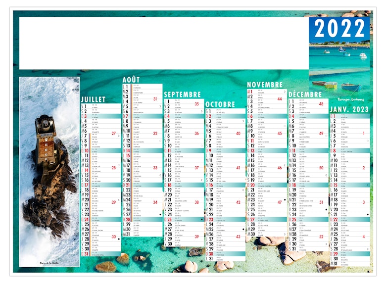 C'est un calendrier bancaire avec une grille aux dimanches alignés. Maritime est un bancaire illustré sur le thème de la Bretagne estivale. Ce calendrier est une invitation au départ, une fenêtre ouverte sur la pointe sud Finistère. Découvrez la splendeur des côtes de la mer d'Iroise, grâce aux photos de Mathieu Rivrin. Et non, vous ne rêvez pas, c'est bien en France et plus particulièrement en Bretagne que nous avons ces magnifiques couleurs turquoises. D'où son surnom de Caraïbes Bretonnes.