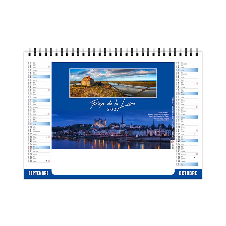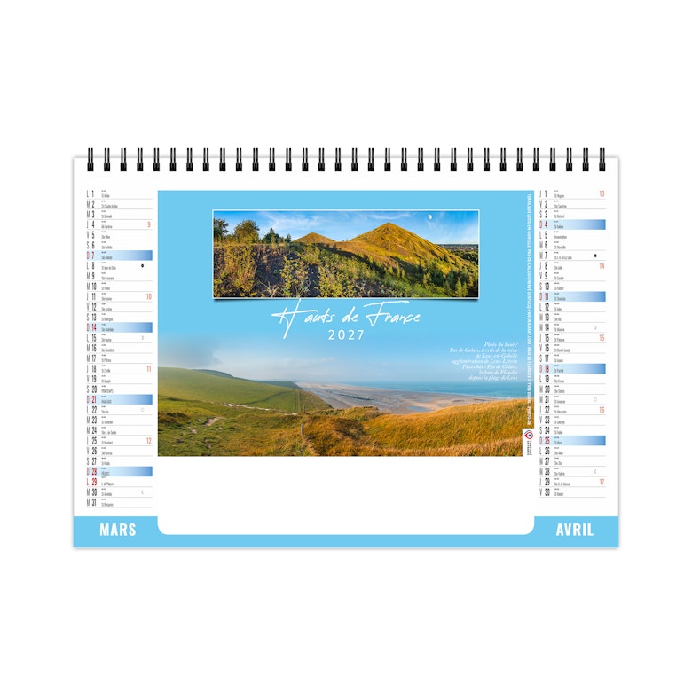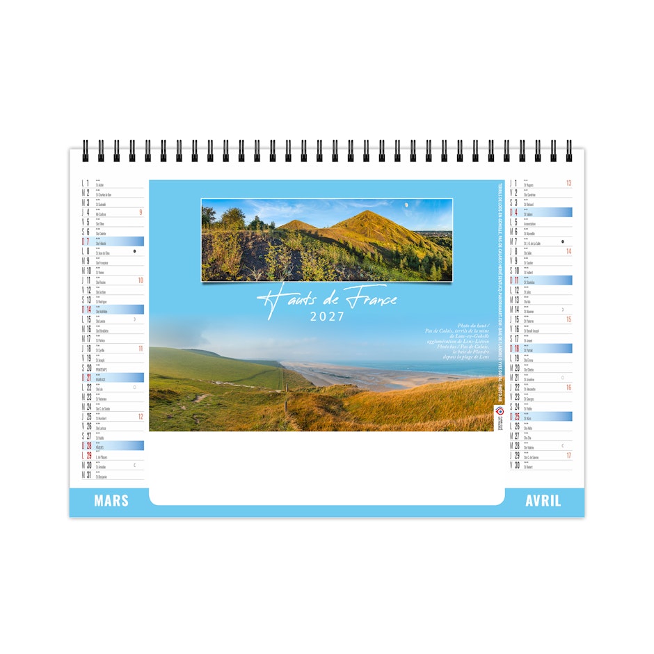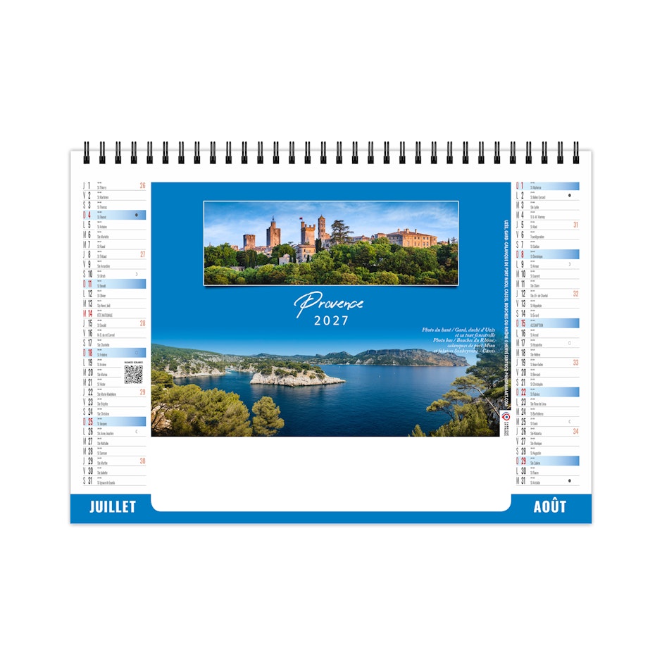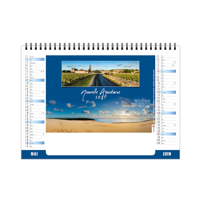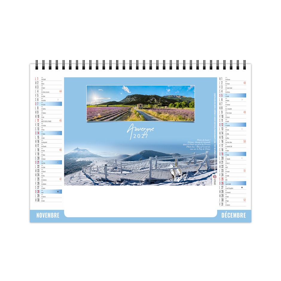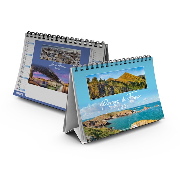 Calendrier illustré de photos panoramiques de sites touristiques français, réalisées par Hervé Sentucq et Yves Duval.