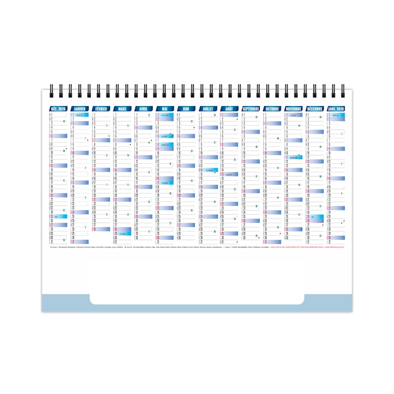 2 mois par feuillet. La grille comprend les numéros de semaines. Les congés scolaires sont sur le verso du 7ème feuillet.