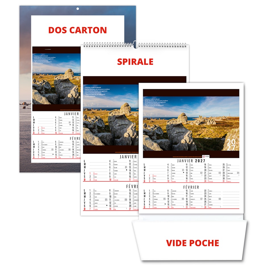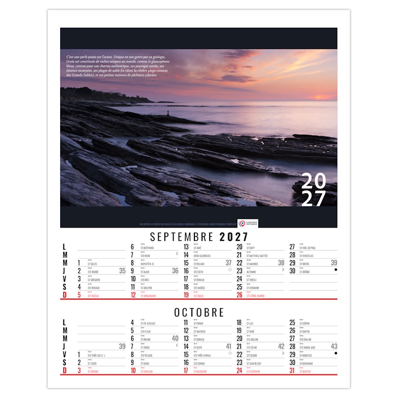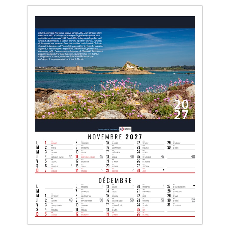 La grille calendaire est composée des Saints, numéros de semaines, phases lunaires, congés scolaires et le compte et décompte journalier. Plus grille 2028 sur dos carton.