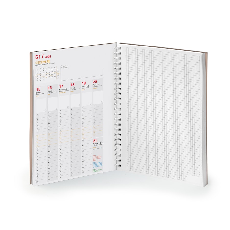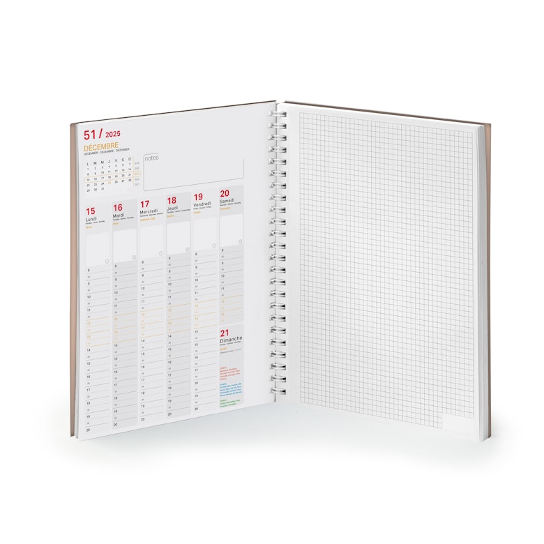 Semainier de 128 pages - 1 page de garde - 1 page départements - 1 page calendaire 2025 - 57 semaines avec des pages notes - grille internationale en 2 couleurs - 4 pages planning 2025 - 1 page index des fêtes à souhaiter - 6 pages notes