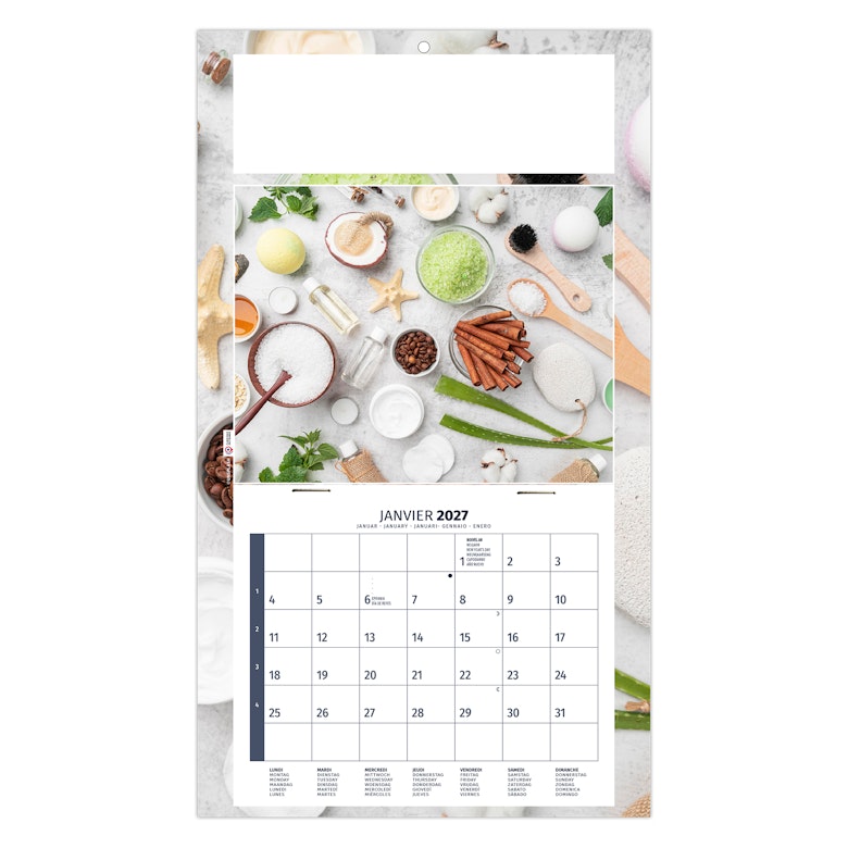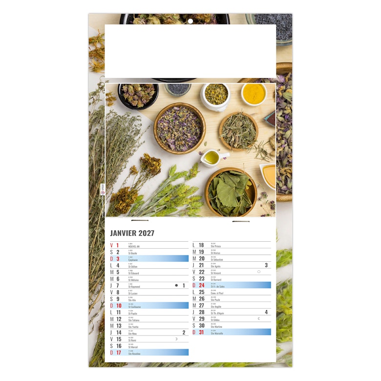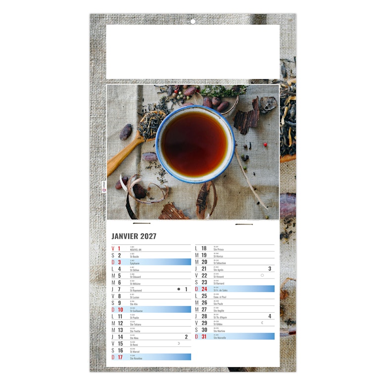 Au choix : Euro Bloc avec les fêtes nationales en 6 langues (D -GB - NL - L - I - E) ou Bloc éphéméride B2, mensuel 12 feuillets agrafés sur dos carton avec grille 2028 en fond. 1 mois par page. La grille est composée des Saints, numéros de semaines, congés scolaires, phases lunaires, compte et décompte journalier.