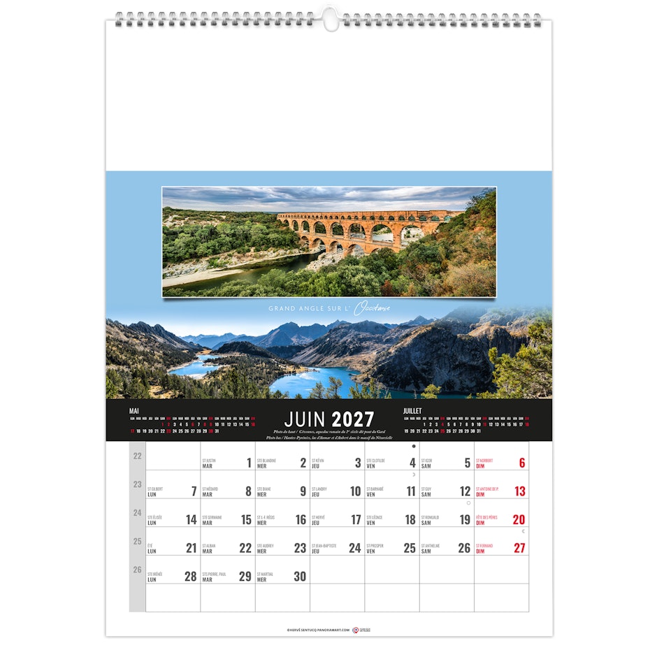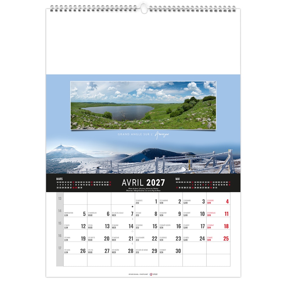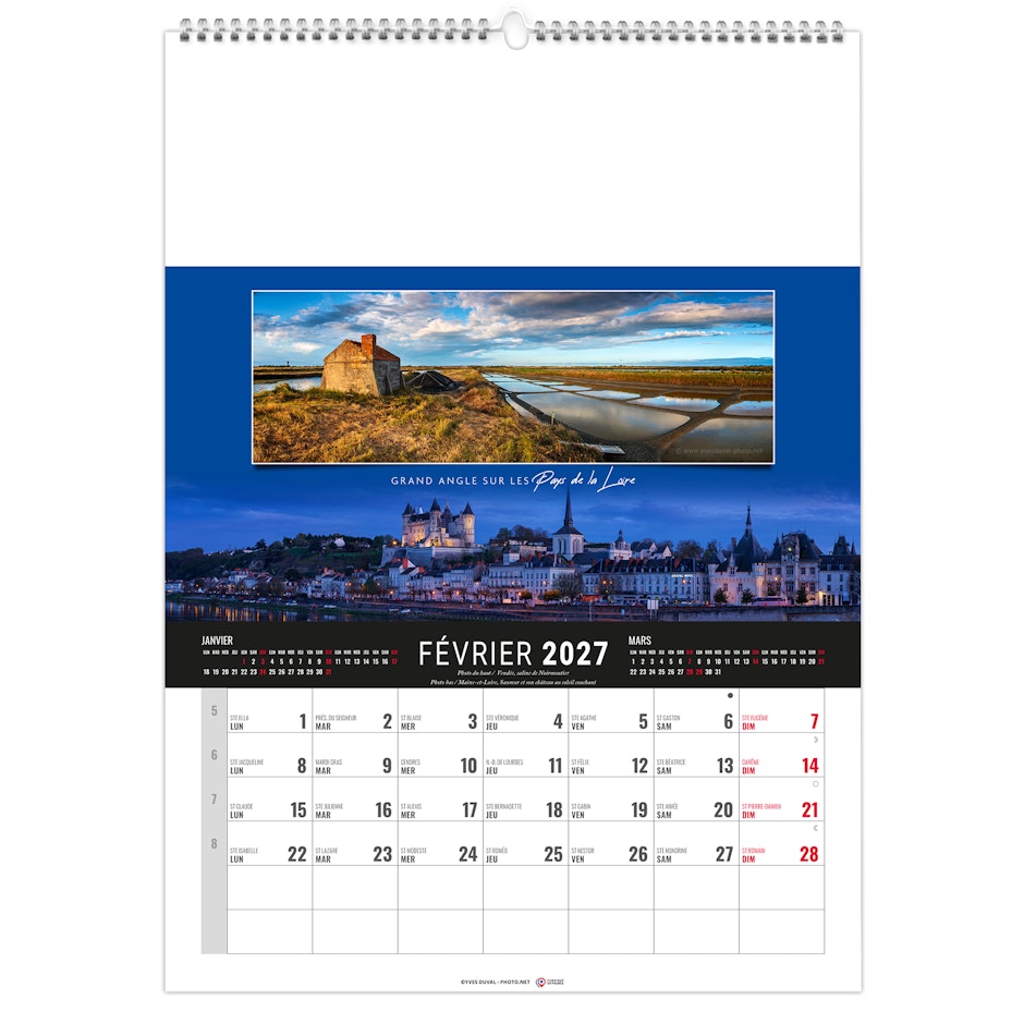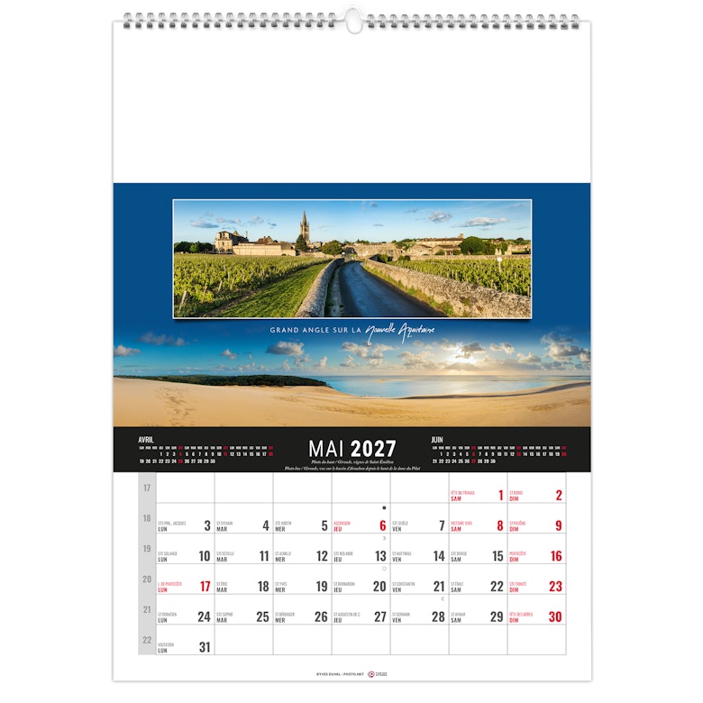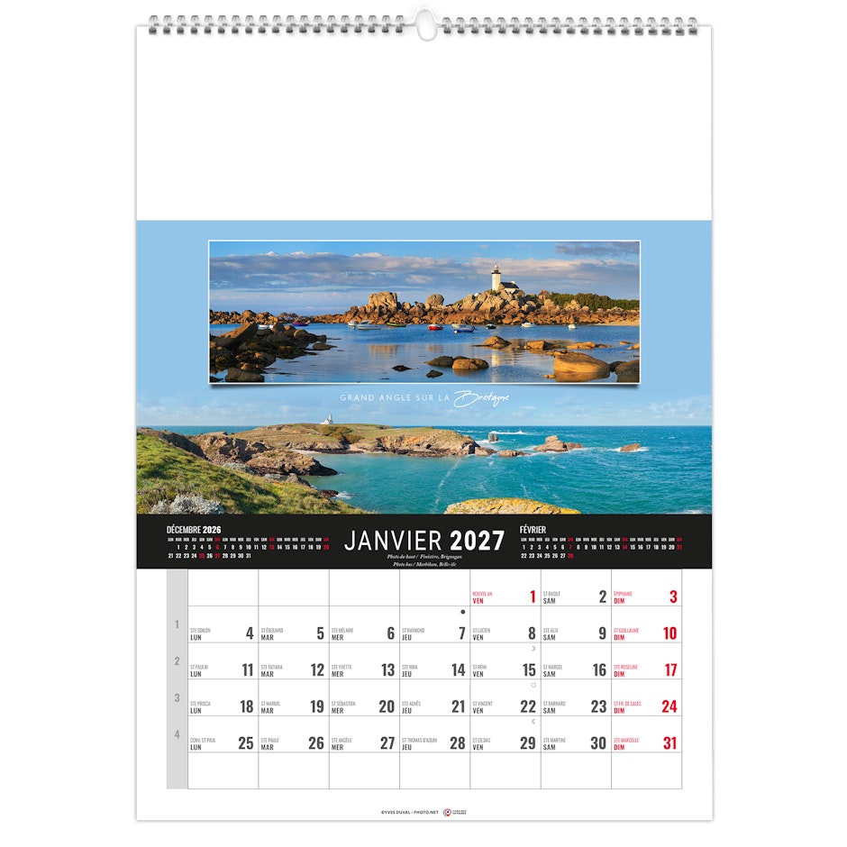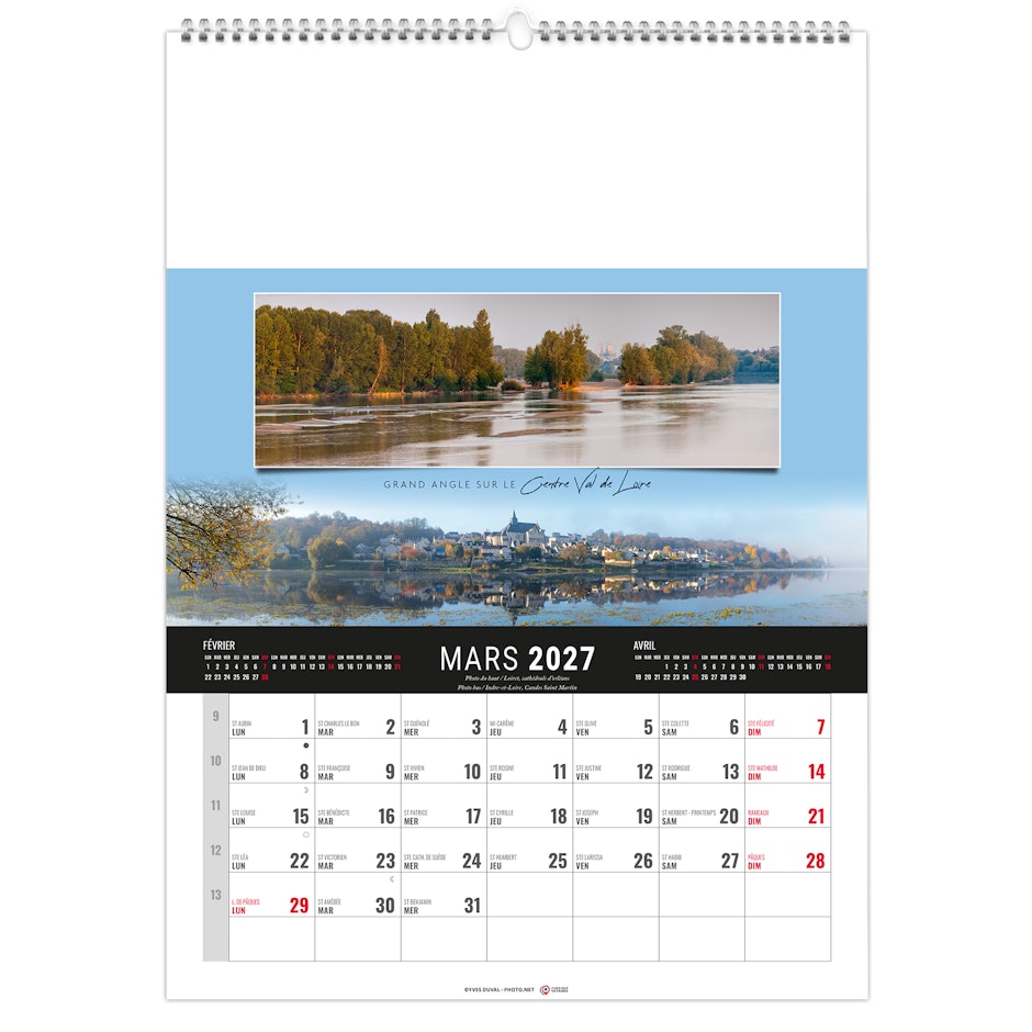 Calendrier 12 feuillets : 1 mois par page et 1 visuel par mois. Grille américaine, avec le mois précédent et le mois suivant sur le feuillet. Phases lunaires, fêtes et congés scolaires.