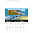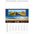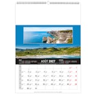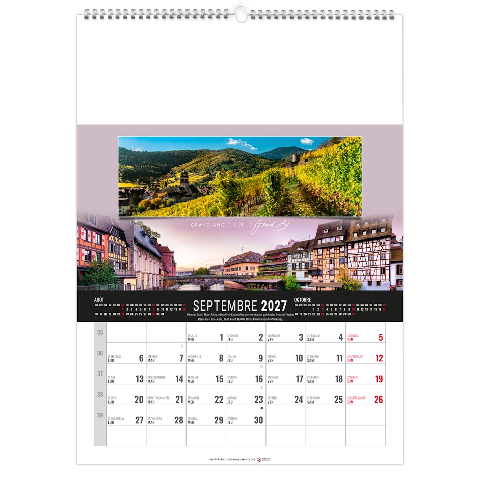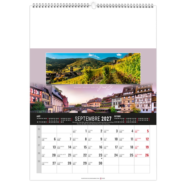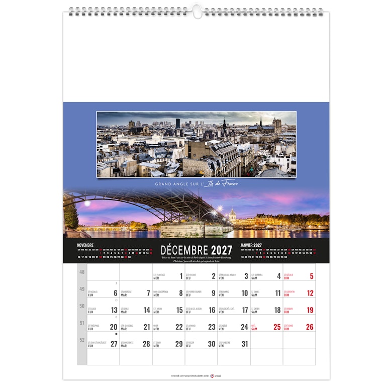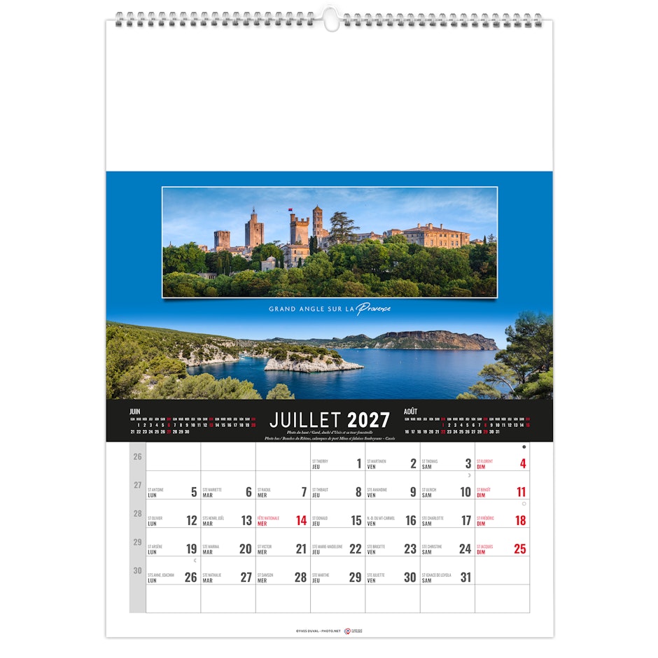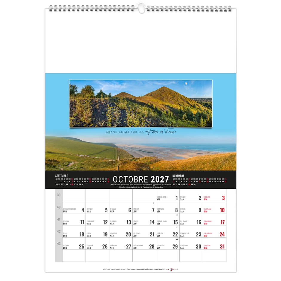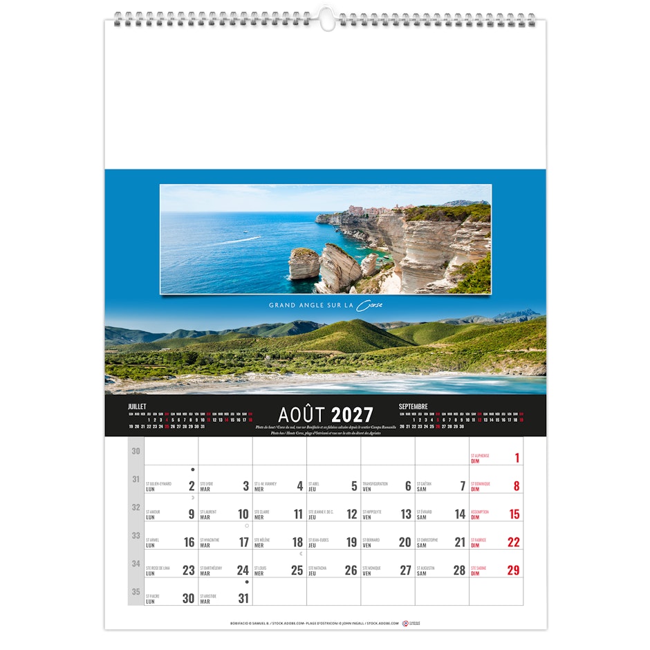Calendrier 12 feuillets : 1 mois par page et 1 visuel par mois. Grille américaine, avec le mois précédent et le mois suivant sur le feuillet. Phases lunaires, fêtes et congés scolaires.