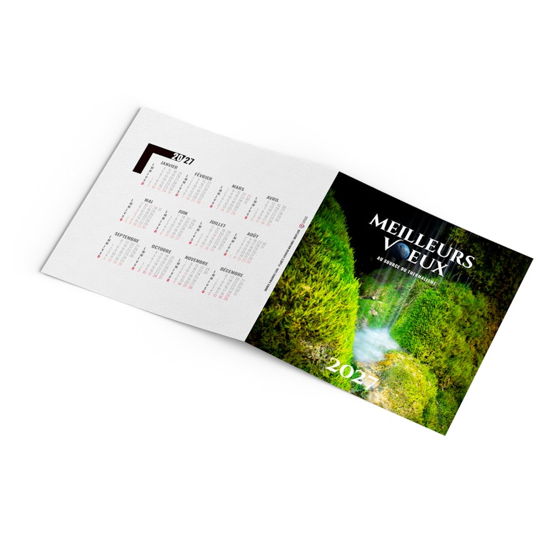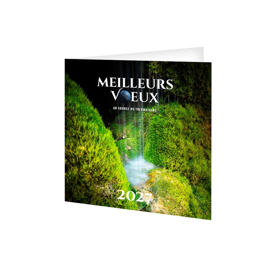 Découvrez notre carte de voeux publicitaire avec calendrier 2027. Souhaitez vos meilleurs voeux à tout votre entourage avec cette carte illustrée sur le thème de l'eau, source du thermalisme. Photographie Unsplash.