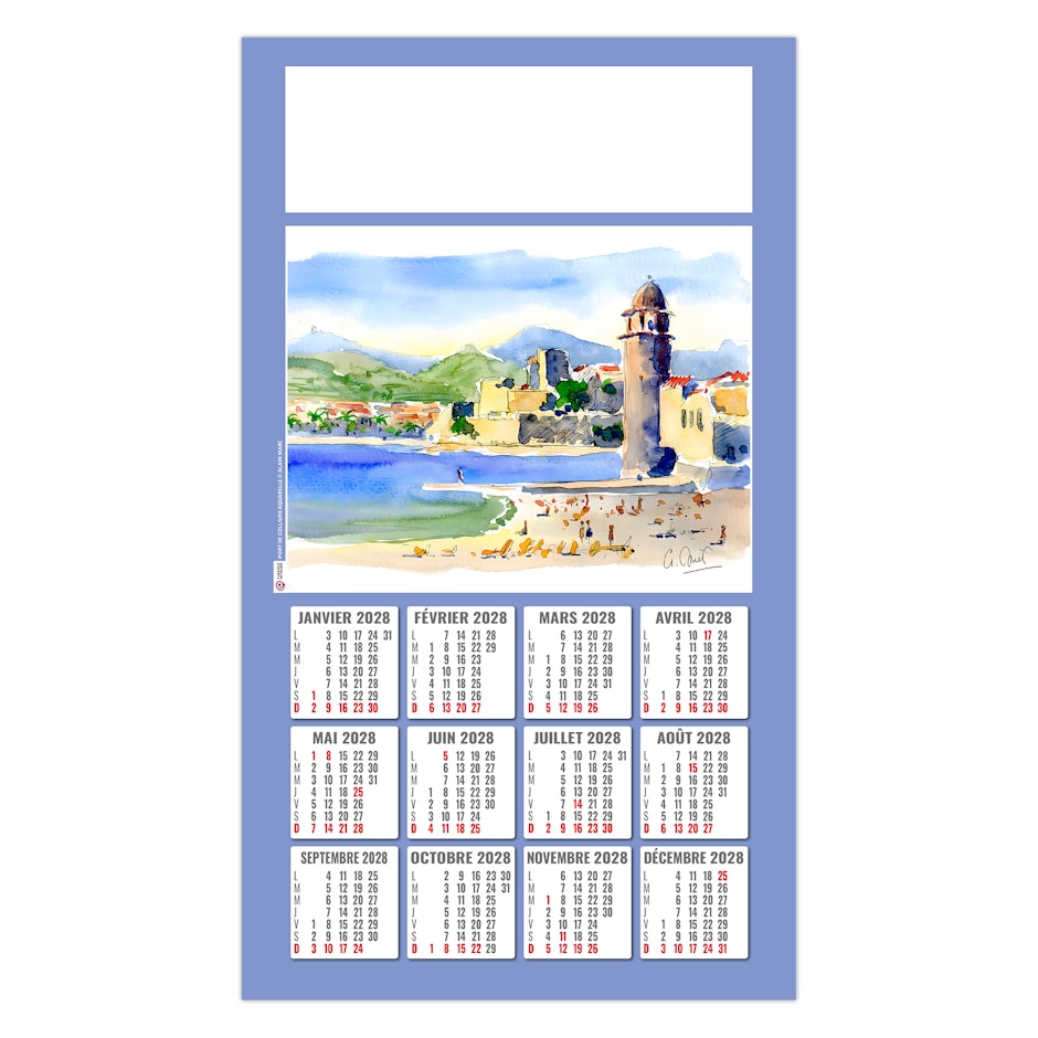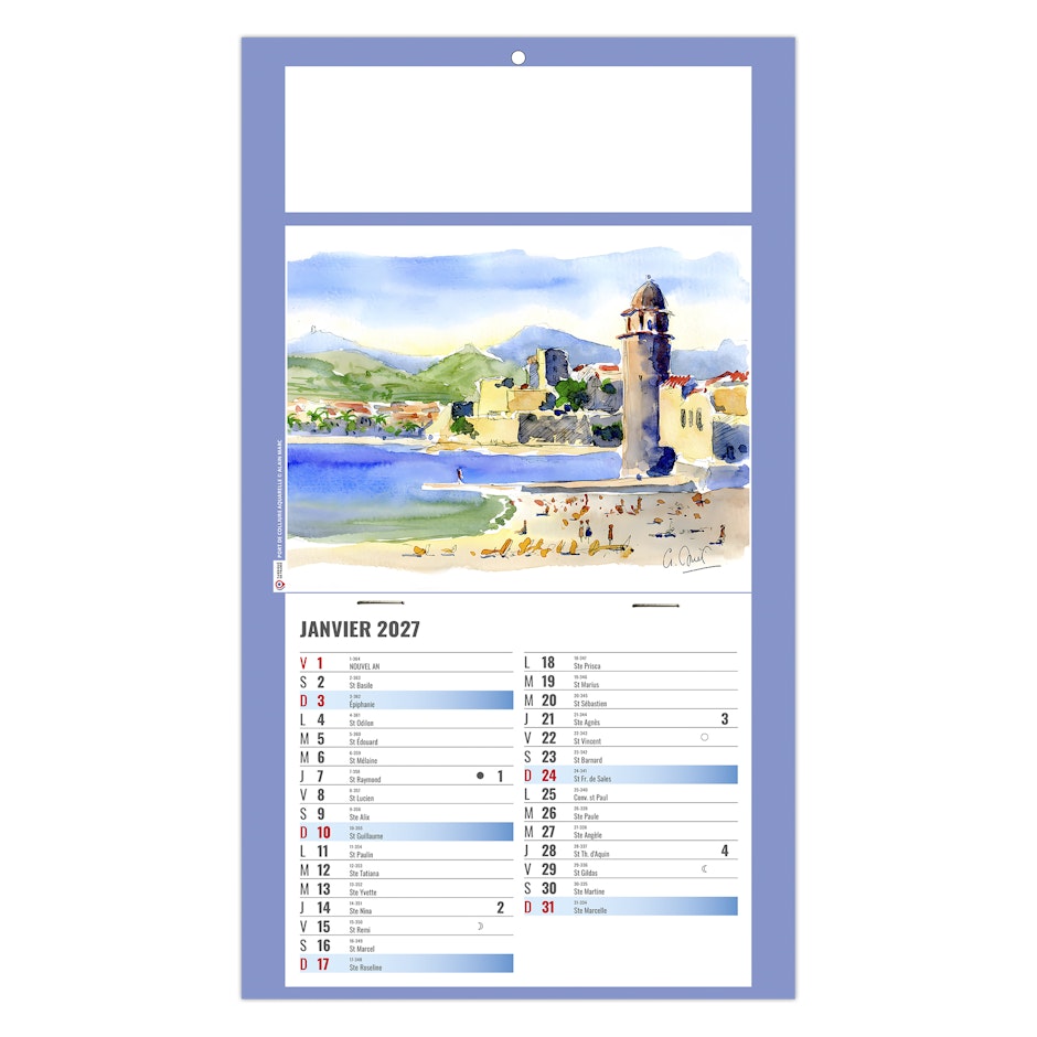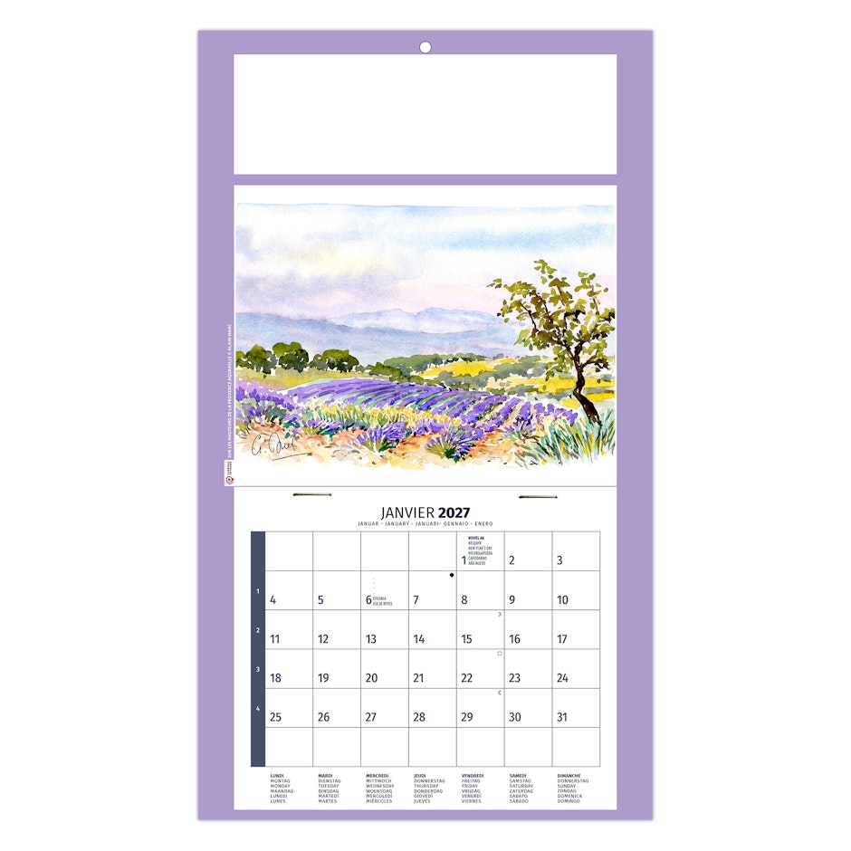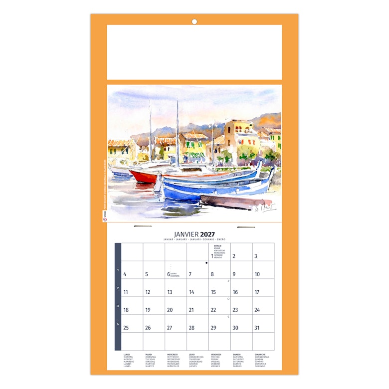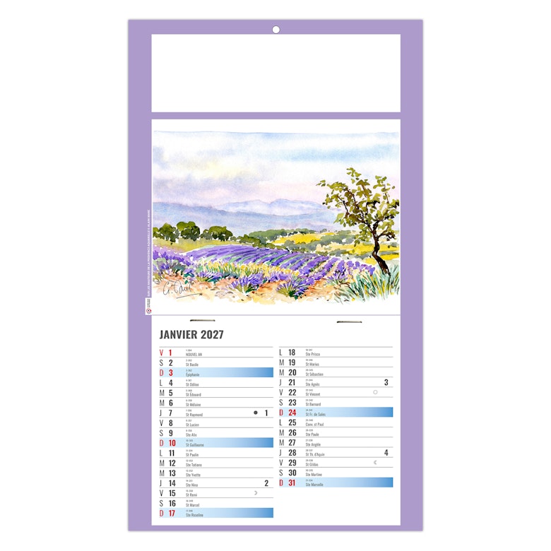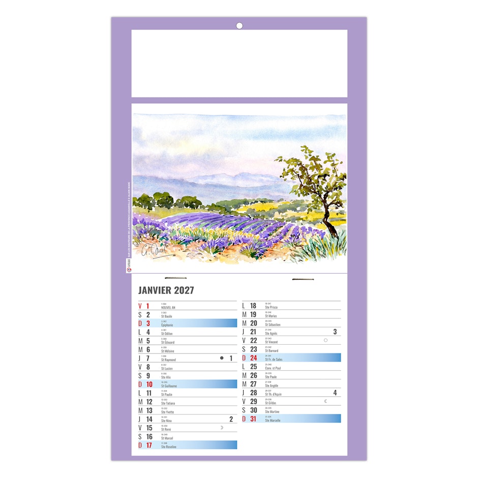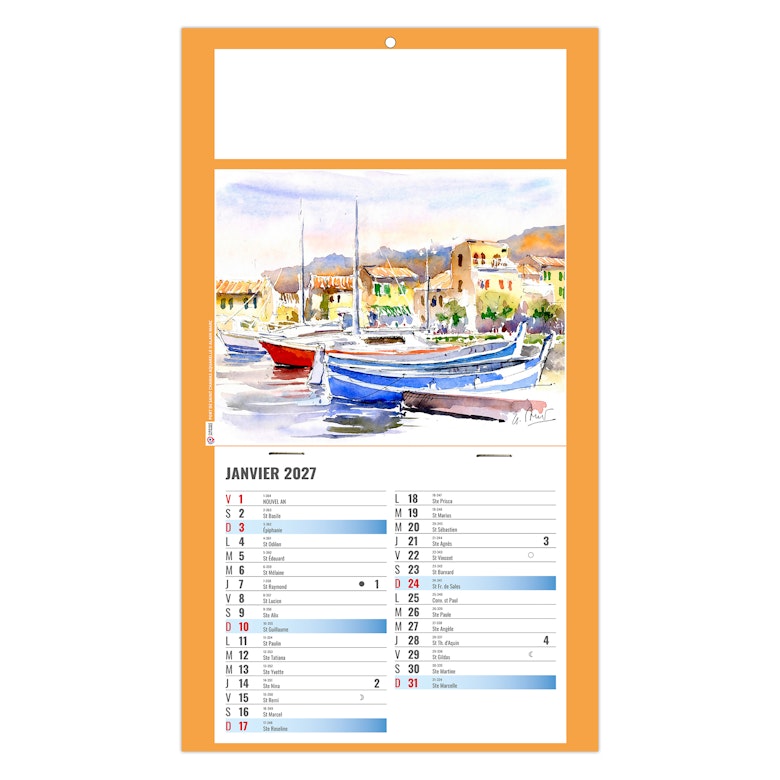 Calendrier illustré de 4 aquarelles réalisées par Alain Marc sur la Provence, ses côtes, sa mer turquoise, ses embarcations colorées au port, mais également ses champs de lavande sur les hauteurs.