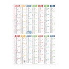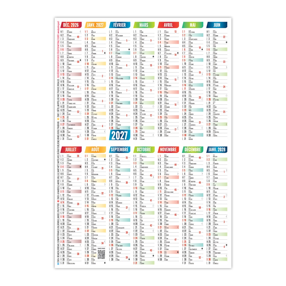 Calendrier 12 mois composé des Saints, n° de semaines, phases lunaires et congés scolaires.