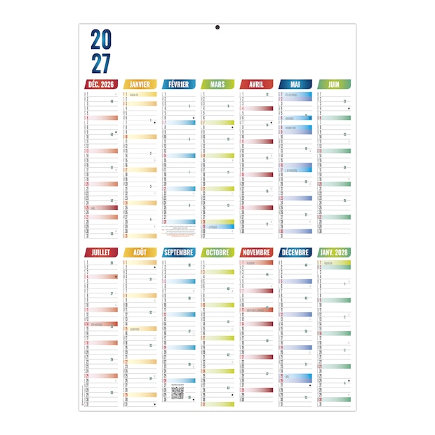 14 mois sur une face. La grille comprend les numéros de semaines, phases lunaires, et les congés scolaires.