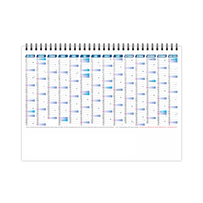 2 mois par feuillet. La grille comprend les numéros de semaines. Les congés scolaires sont sur le verso du 7ème feuillet.