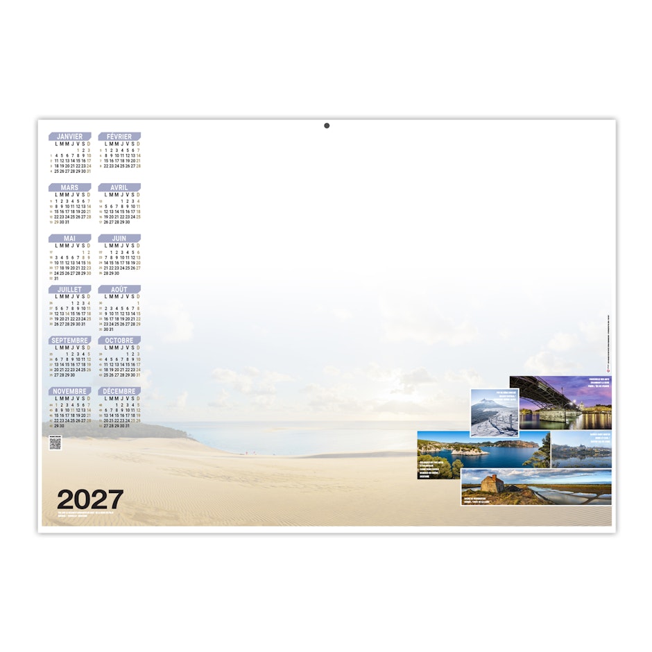 12 mois sur une face. La grille comprend les numéros de semaines, phases lunaires, et les congés scolaires. Et une mosaïque de photos sur le thème des paysages de France. Photogtraphies Yves Duval - Hervé Sentucq.