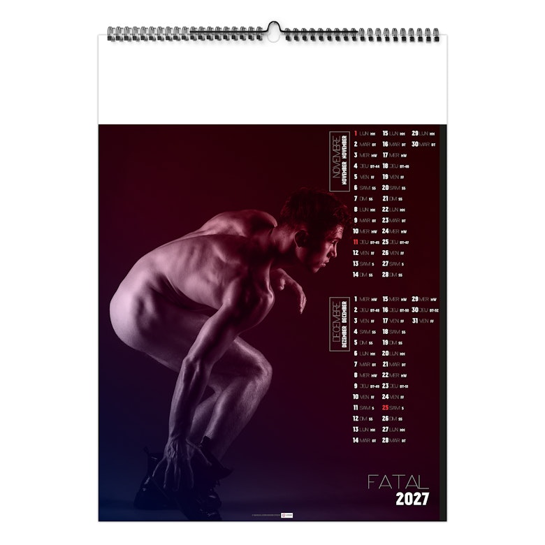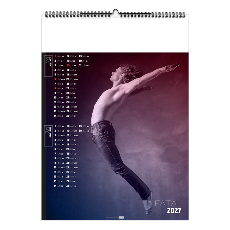 2 mois par page. La grille comprend les jours et mois en 3 langues (Français, Anglais, Allemand), les n° de semaines et jours fériés.