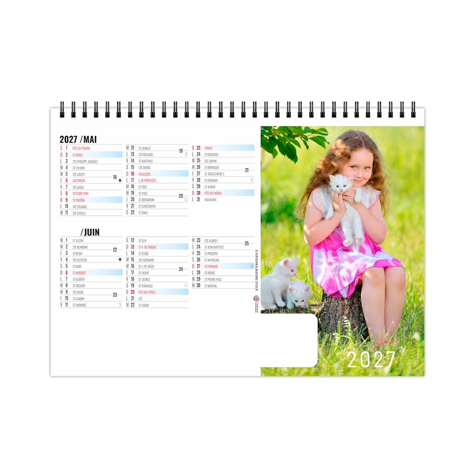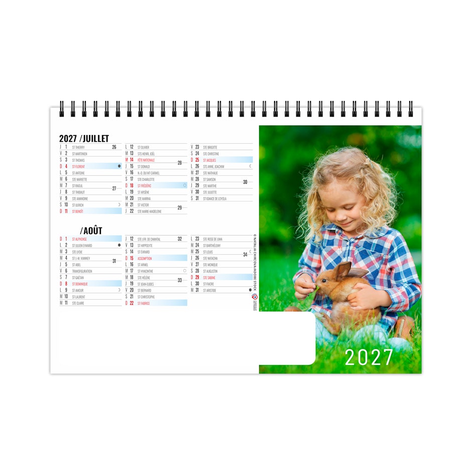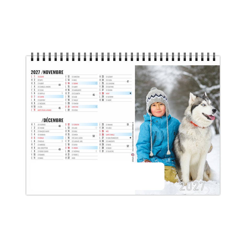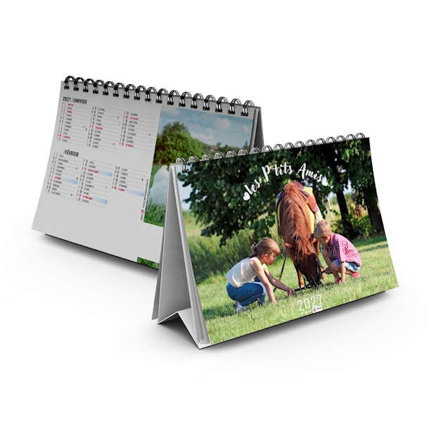 Chevalet de bureau illustré de 6 photos d'enfants accompagnés de leur fidèle animal. Photographies Adobe stockphotos.