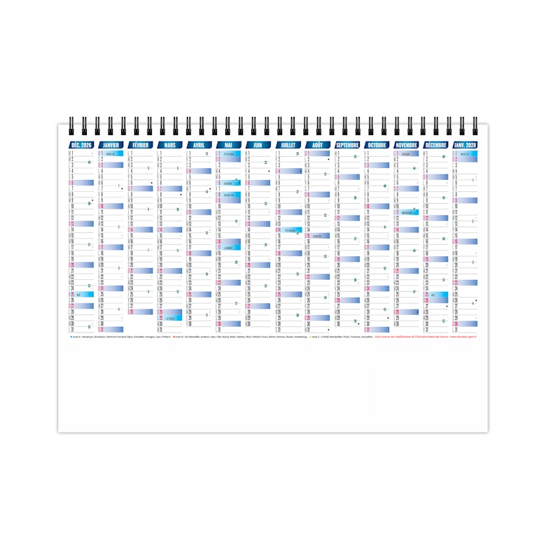 2 mois par feuillet. La grille comprend les numéros de semaines. Les congés scolaires sont sur le verso du 7ème feuillet.