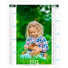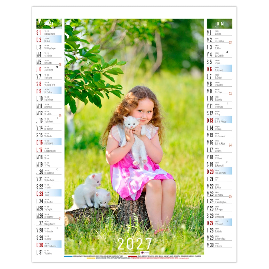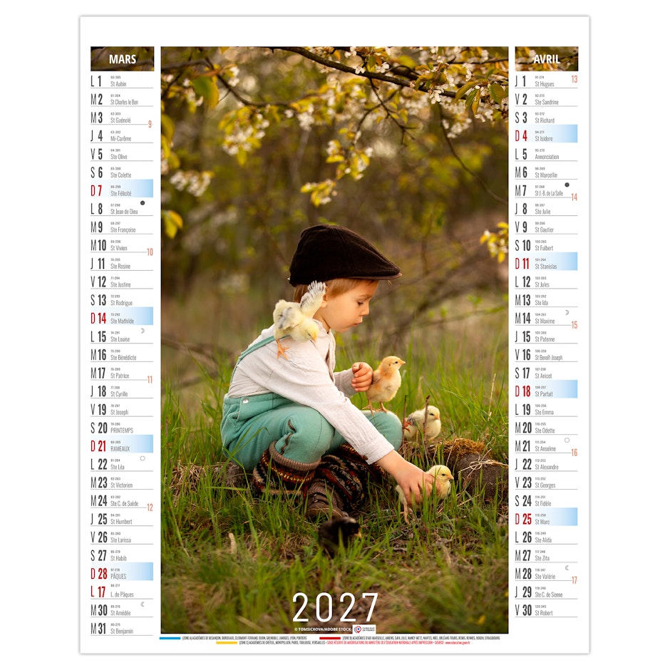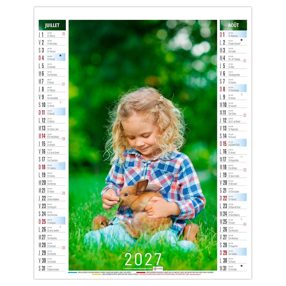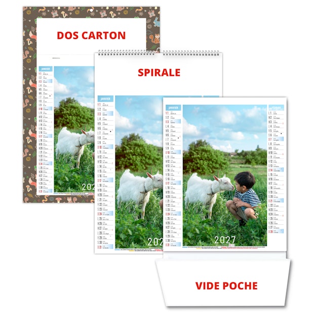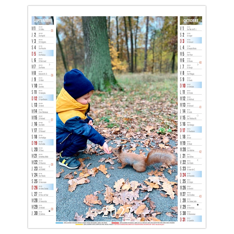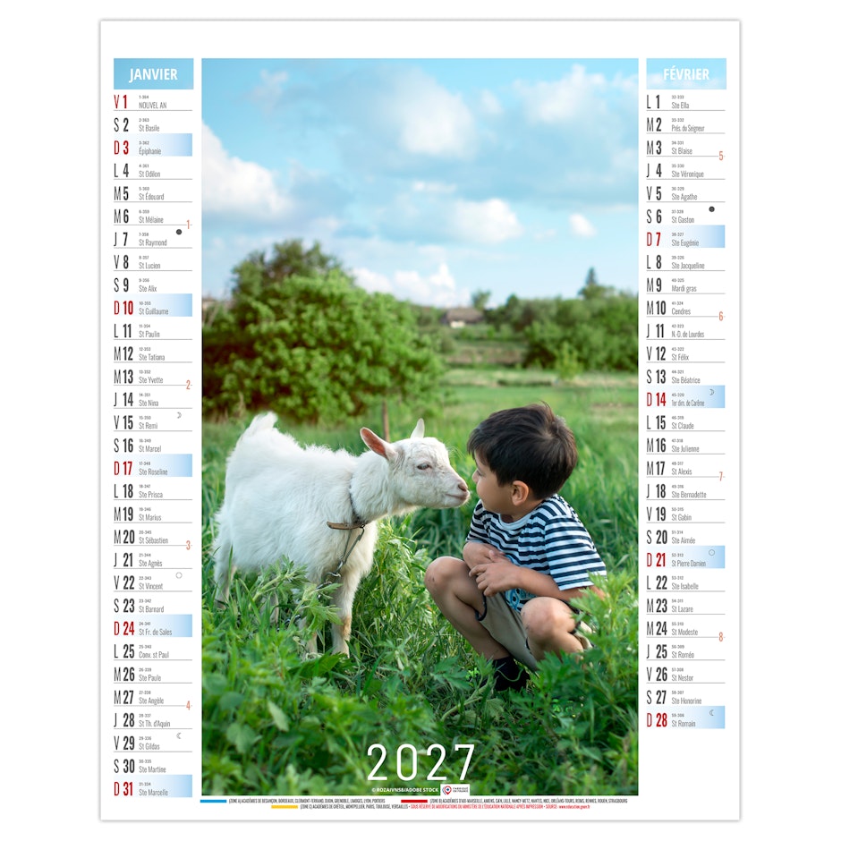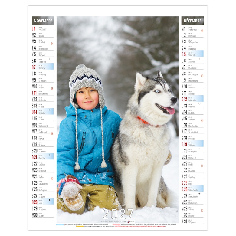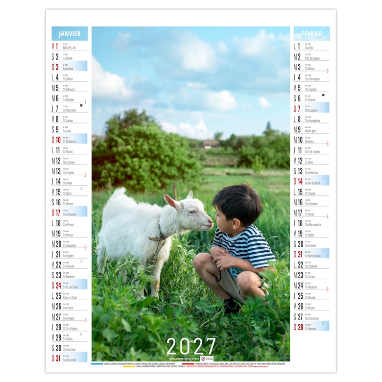 La grille calendaire est composée des Saints, numéros de semaines, phases lunaires, congés scolaires et le compte et décompte journalier. Plus grille 2028 sur dos carton.