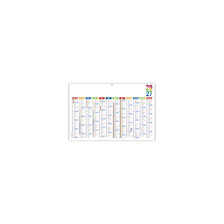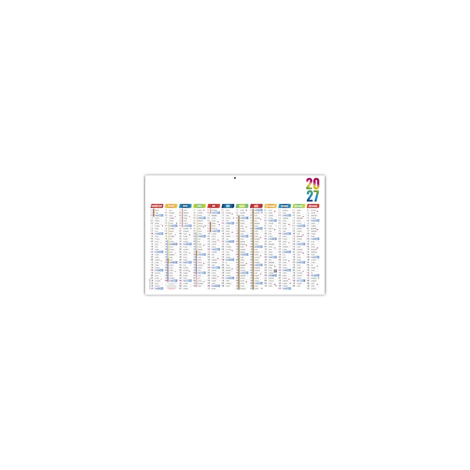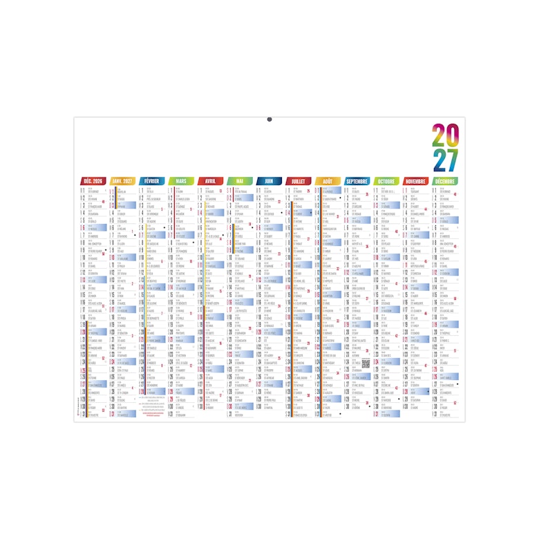 La grille calendaire multicouleur comprend les Saints, n° de semaines, phases lunaires, congés scolaires et le compte et décompte journalier.