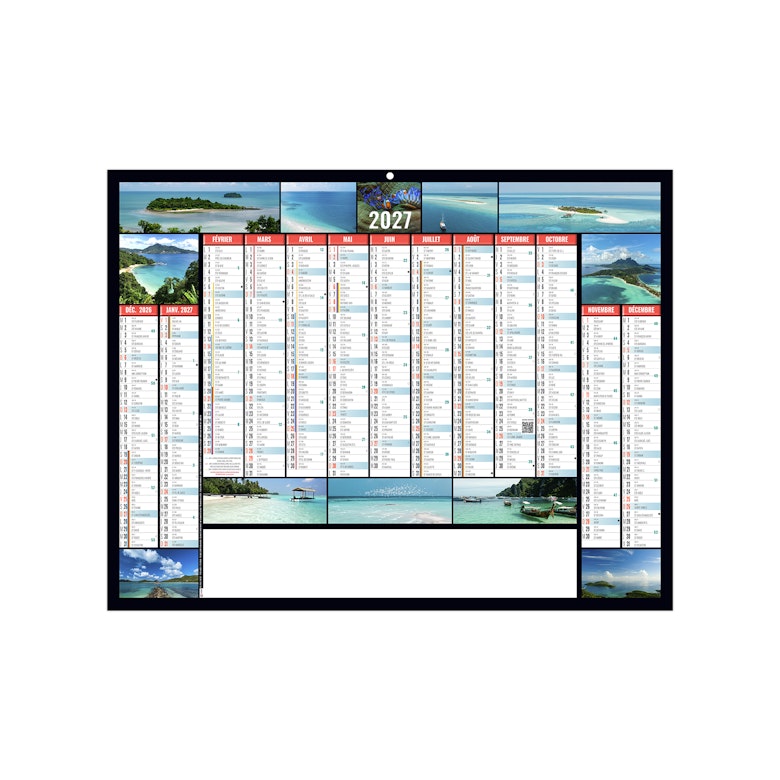 Calendrier 13 mois sur fond noir, illustré de photos d'îles, plages sous les tropiques, qui évoque une ambiance estivale de vacances. Photographies Unsplash.