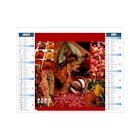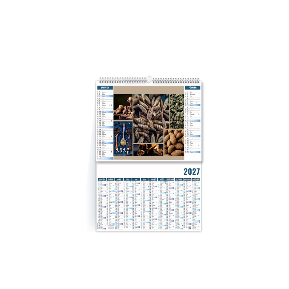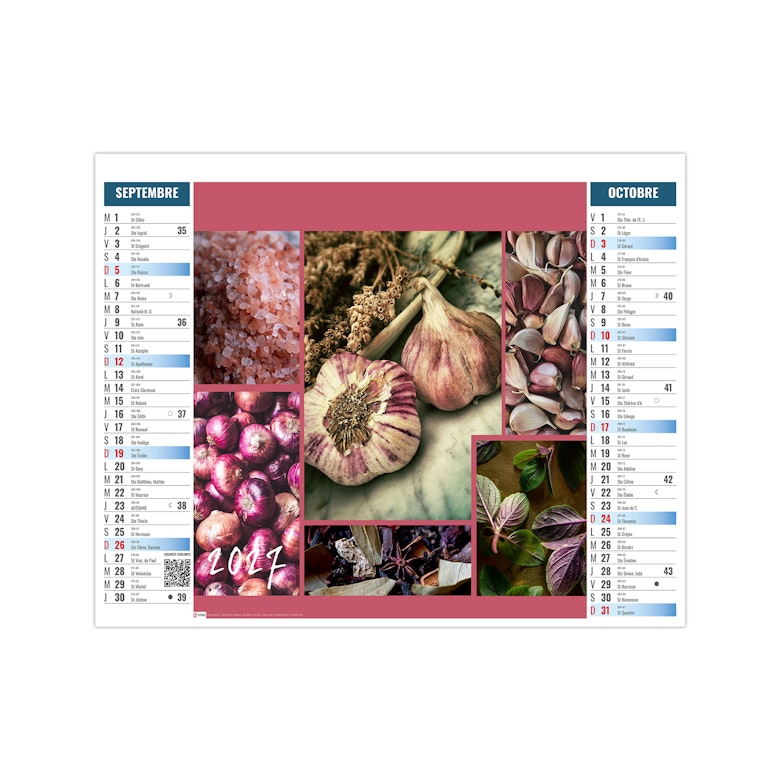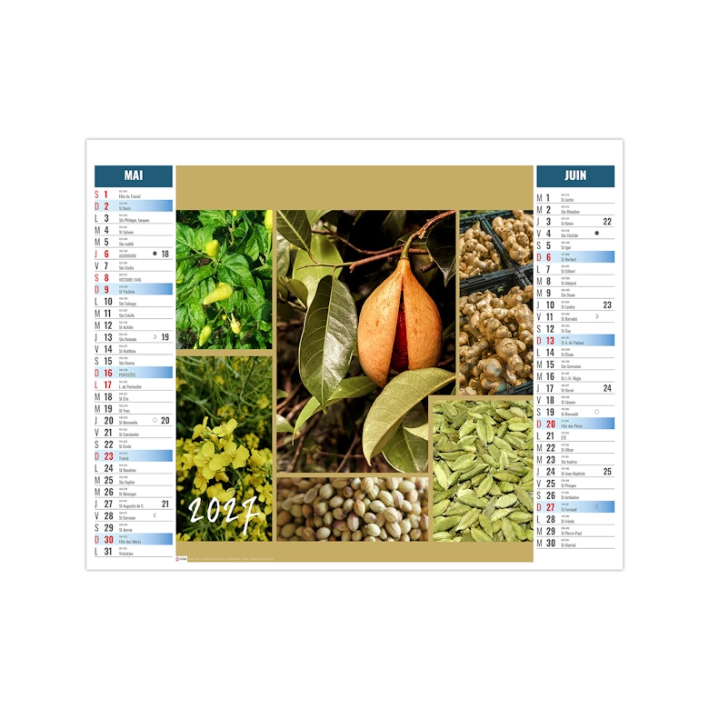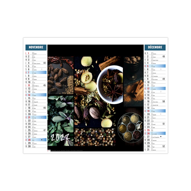 Ce calendrier bancaire est illustré dans sa partie haute, d'une mosaïque de photos d'aromates. Photographies Unsplash.