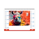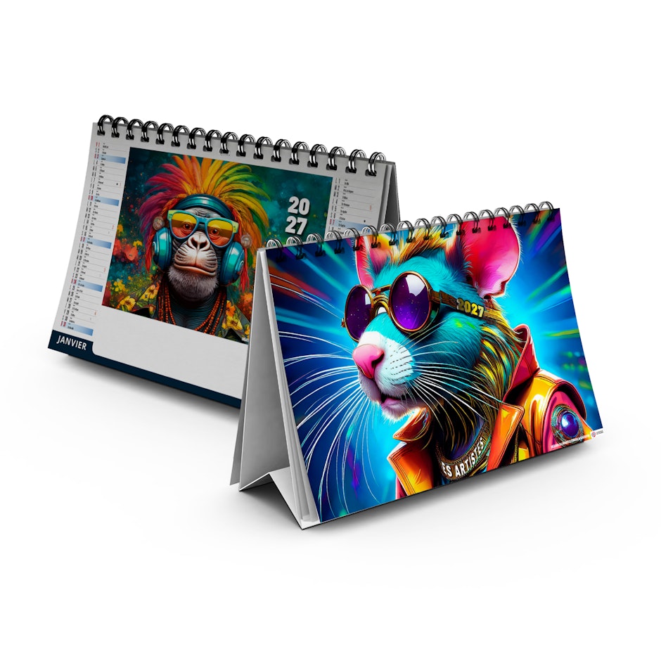 Chevalet de bureau illustré de 6 portraits d'animaux dans le style pop'art réalisés avec IA générative par Calendriers Alexandre.