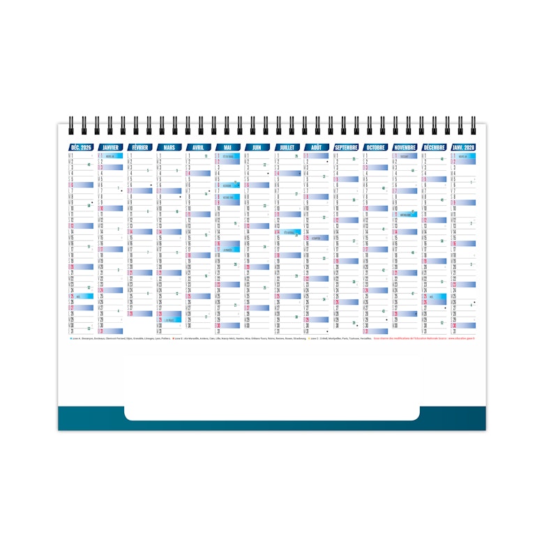 2 mois par feuillet. La grille comprend les numéros de semaines. Les congés scolaires sont sur le verso du 7ème feuillet.