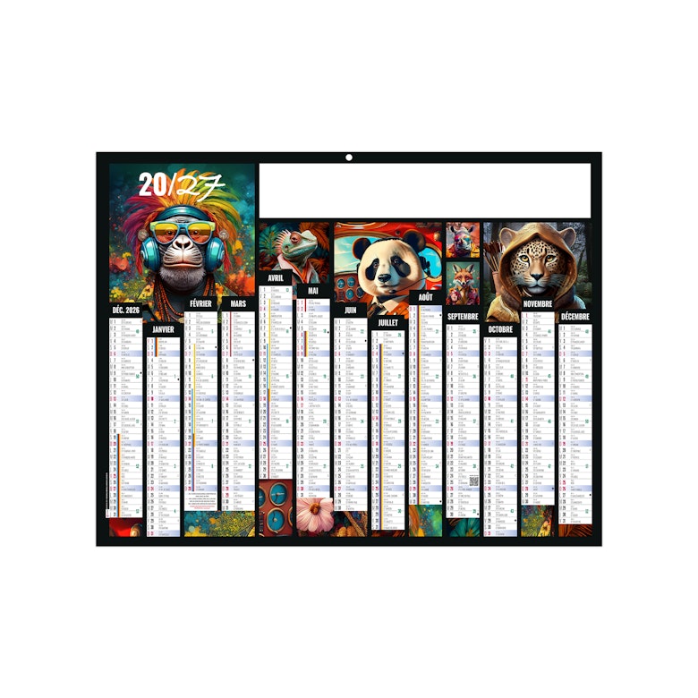 Ce calendrier bancaire est illustré d'une galerie de portrait d'animaux Pop'art. Style artistique né dans les années 1960, le Popart se caractérise par ses couleurs chatoyantes et son style répétitif. Le Popart des animaux se détache du style dorigine Popart dans sa quête de représentation très fidèle du sujet, les couleurs venant souvent mettre en exergue le caractère de l'animal. ©Tous ses visuels ont été créé avec l'IA générative par Calendriers Alexandre.