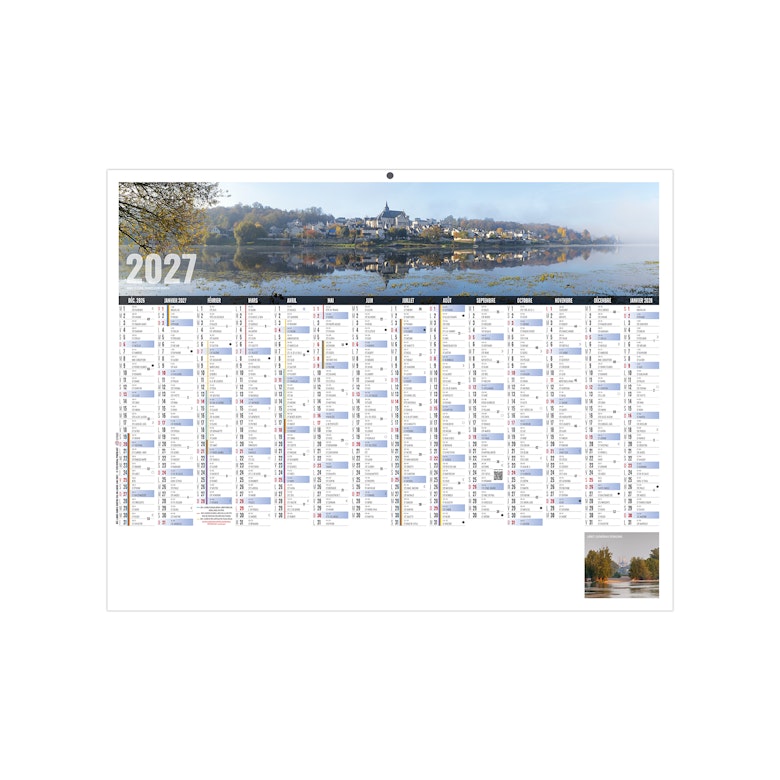 Calendrier avec une vue panoramique du petit village de Candes Village de Candes-Saint-Martin, Indre-et-Loire, au petit jour en bordure de Loire dans la brume matinale et la cathédrale Sainte-Croix d'Orléans dans le Loiret, que l'on aperçoit entre les arbres au couleur de l'automne. Ce calendrier est composé de 14 mois sur la face avant et pour il y a 10 choix pour le verso. Photographies d'HERVÉ SENTUCQ.