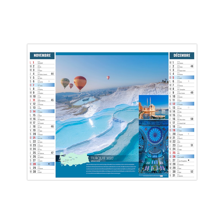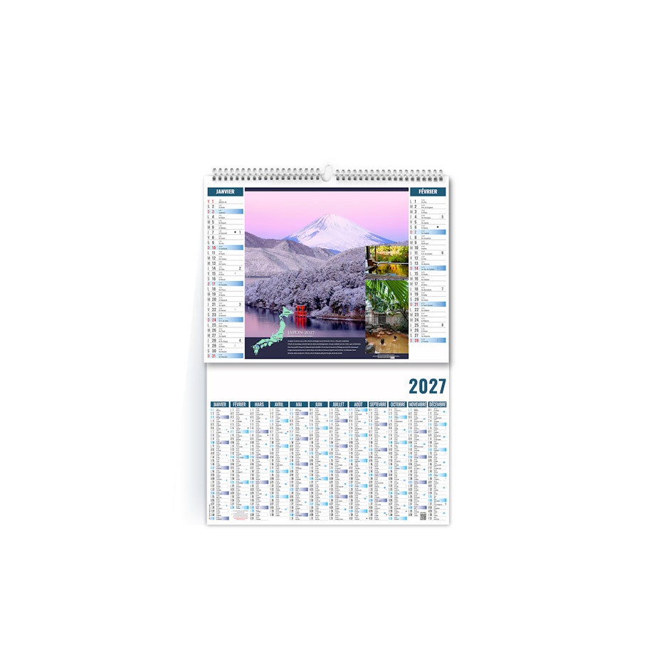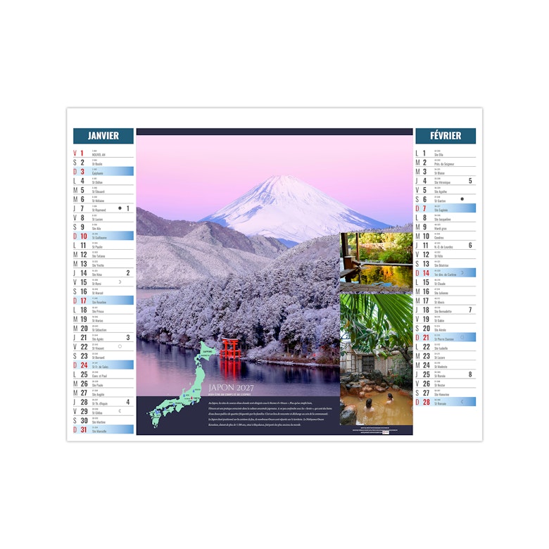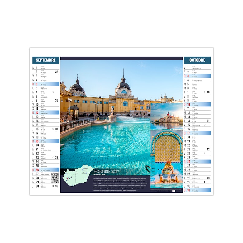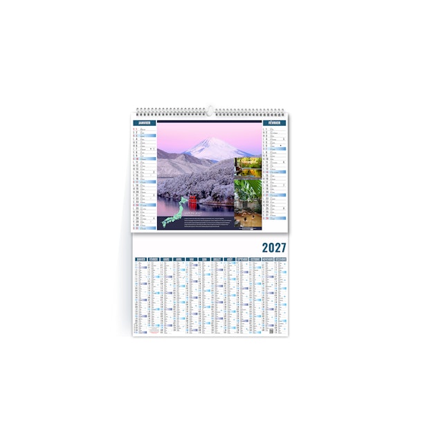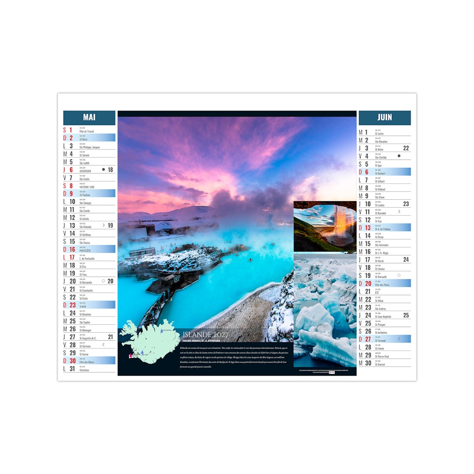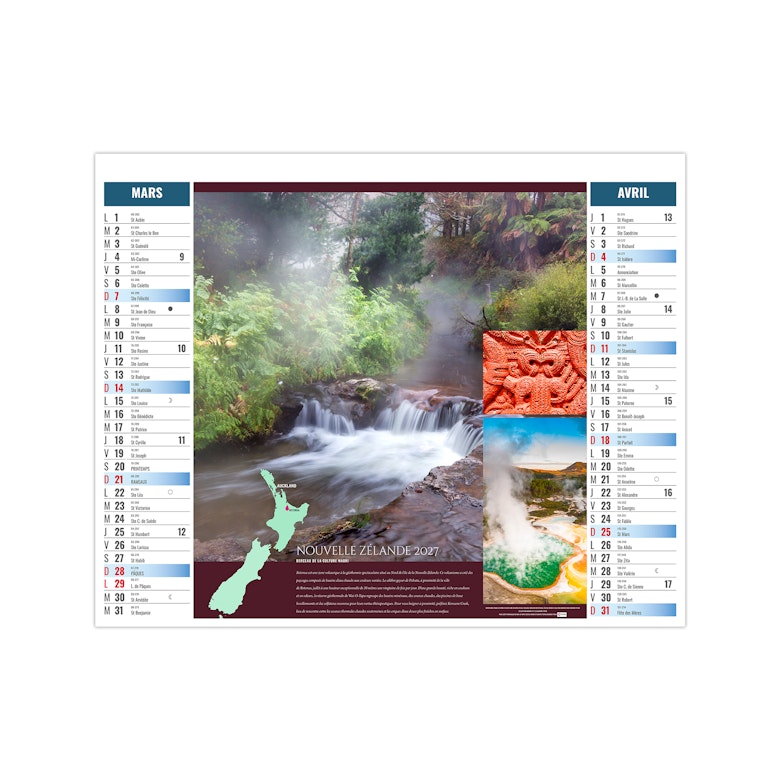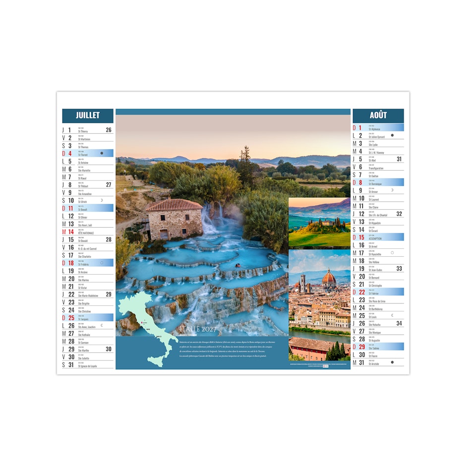 Ce calendrier bancaire est illustré dans sa partie haute d'une présentation de lieu où l'activité thermale est importante et offre des paysages exceptionnels. Pratique, ce calendrier se replie pour la mise sous pli. Photographies Adobe stock photos - Hemis - Unsplash.