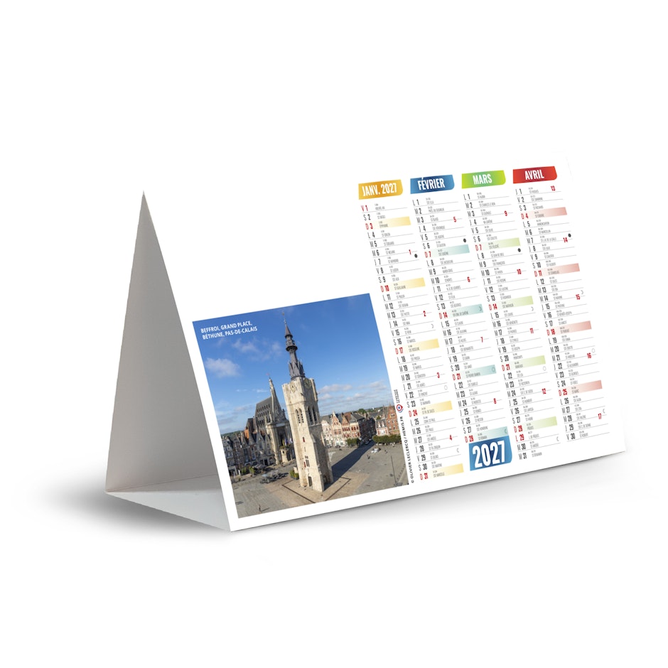 Chevalet de comptoir 3 faces illustré de photos de sites exceptionnels de patrimoine français, comme le Beffroi de la Grand Place à Béthune, dans le Pas-de-Calais, le Moulin à vent du XIIe siècle du parc naturel régional du Luberon à Saint-Saturnin-lès-Apt, dans le Vaucluse ou encore le magnifique Manoir de La Salle à Saint-Léon-sur Vézère dans la Dordogne. Photographies Hemis.